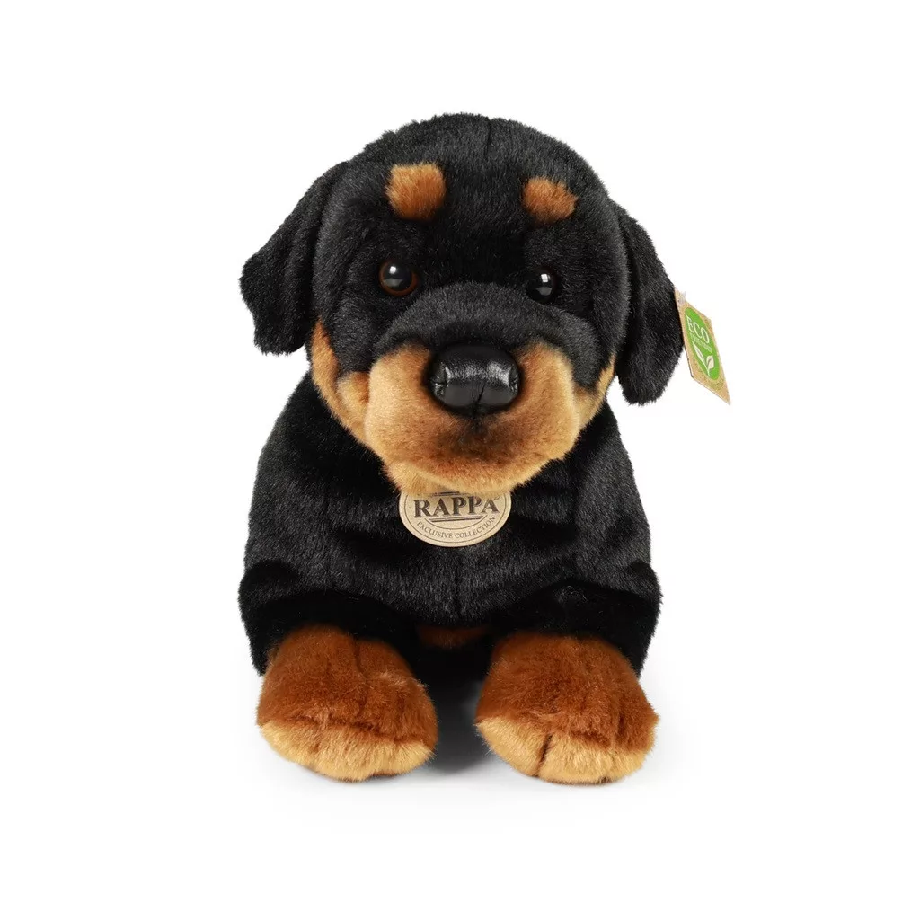A fekvő rottweiler 39 cm-es méretben különösen látványos és ölelgetnivaló. A RAPPA kollekció része, környezetbarát töltettel.