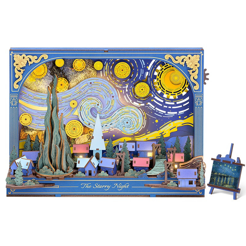 Ez a különleges 3D fa kirakó a csillagos éjszaka varázslatos hangulatát kelti életre, tele mozgó mechanikus elemekkel és részletgazdag kidolgozással. A fogaskerekek által mozgatott csillagok és hold, valamint a finom LED világítás igazán egyedi dekorációvá teszik.