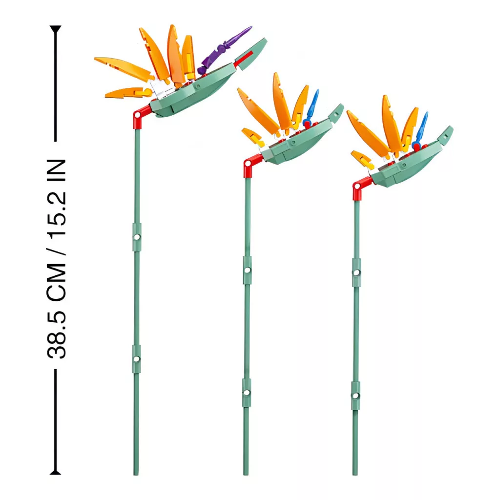 A Sluban Flowers Királyi strelitzia különleges dekorációs készlet, amely üde színfolt lehet otthon vagy ajándékként is. A szett 269 elemből áll, közepes nehézségi szintű, ezért 6 éves kortól ajánlott. Az összeállított csokor három nyíló virágot és három bimbót tartalmaz.