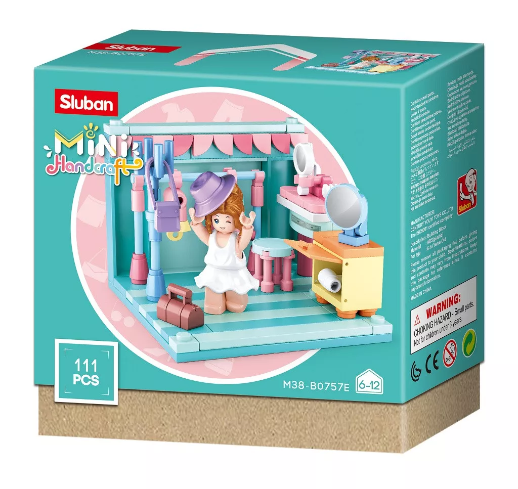 A Sluban Handcraft Gardrób kedves, kisebb készlet, amely jól illik otthonos szerepjátékokhoz. A készlet 111 elemet és 1 figurát tartalmaz, egyszerű nehézségi szintű, ezért 6 éves kortól ajánlott. Jó választás lehet önálló játéknak vagy más szobás készletek mellé is.