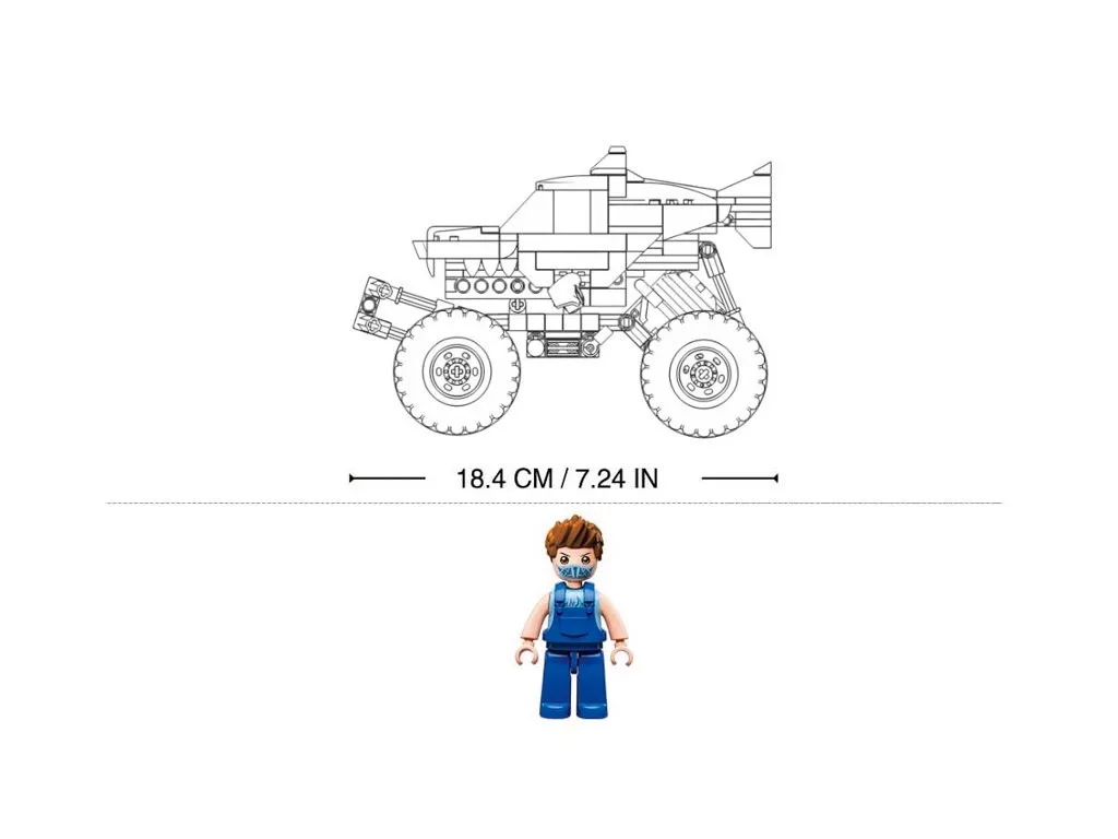 A kék díszítés, a cápa fogaira emlékeztető részlet és a nagy kerekek igazán karakteressé teszik a modellt. A tartós ABS műanyag elemek jól illeszkednek, a mozgatható figurával együtt pedig még élvezetesebb a játék. A készlet más építőkkel is kompatibilis.
