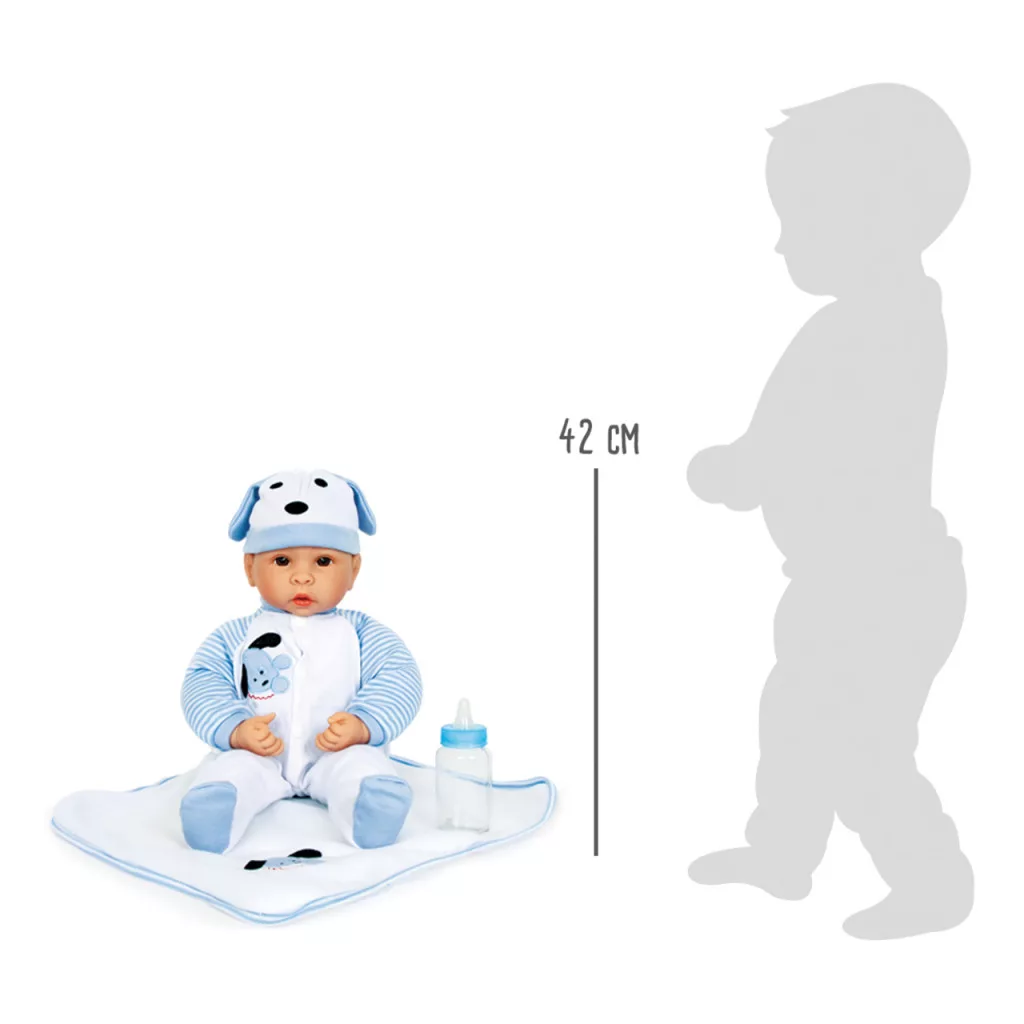 A kis Benno baba minden „kis anyuka” szívét elrabolja aranyos ruháival és kiegészítőivel. Világoskék cumisüveggel, cumival és puha takaróval érkezik. Ruhái különösen kedvesek: a kutyás minták és a lelógó fülű sapka igazi különlegessé teszik. Benno kutyabarát karaktere játékosan jelenik meg, így a gyerekek még inkább megszeretik. Élethű és kedves játékbaba, amely sok szeretetteljes szerepjáték alapja lehet.