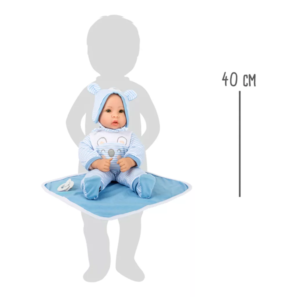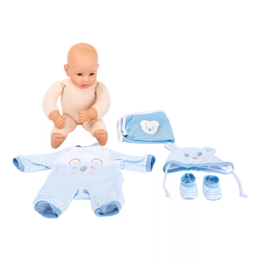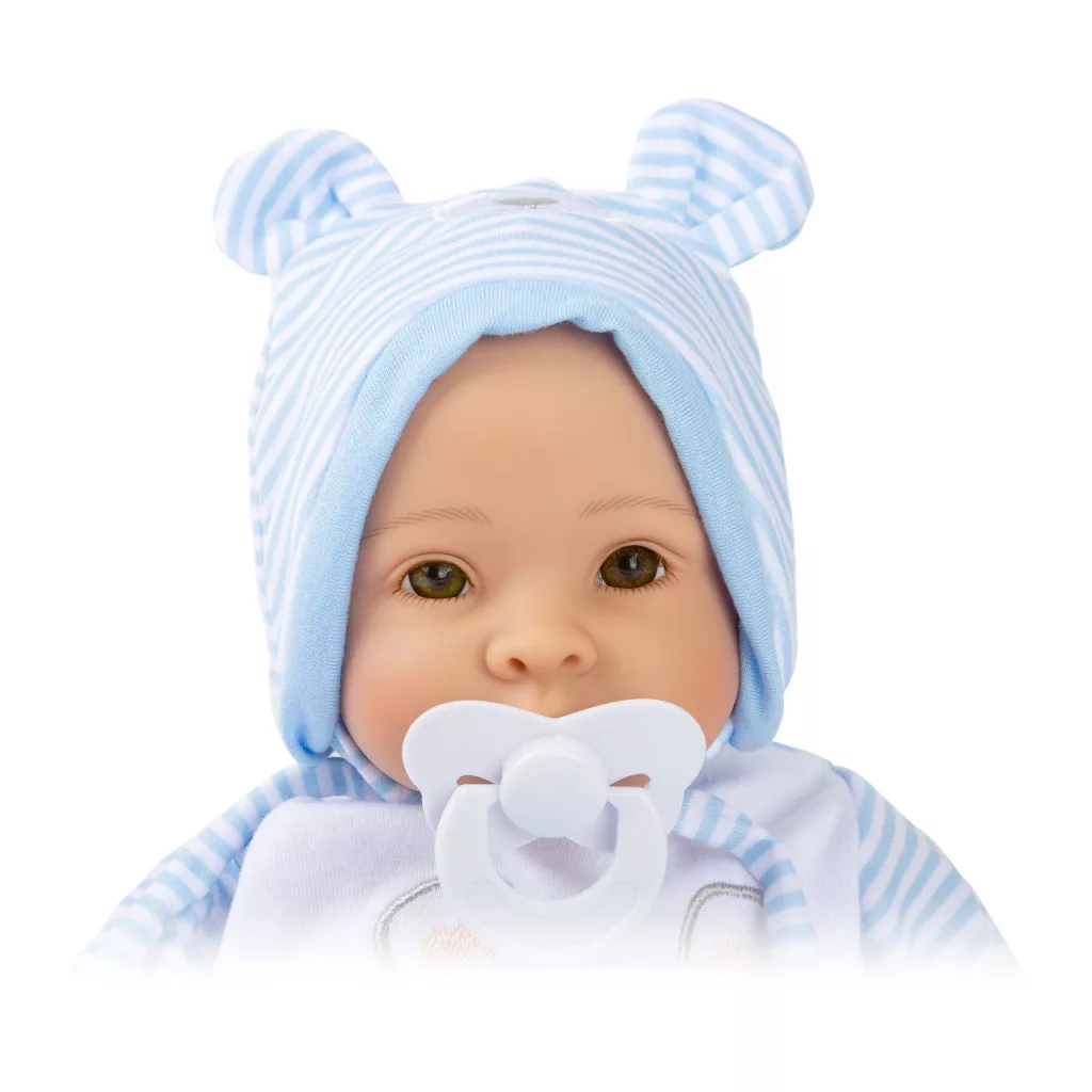 Puha testű, bájos baba ragyogó szemmel és ragasztott szempillával. Csíkos ruhácska, sapka, előke, cumi és takaró tartozék - öltöztethető, ölelhető, szociális készségeket fejleszt.