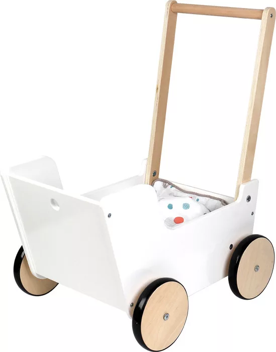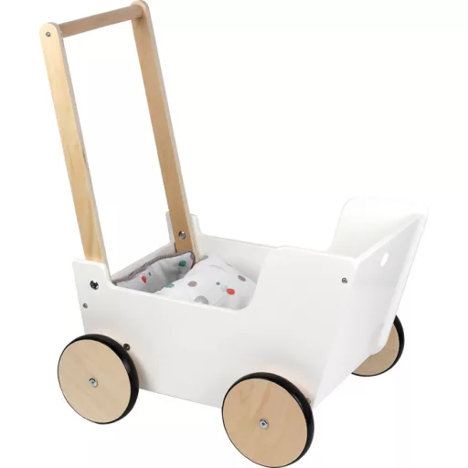 Fa babakocsi kezdő sétálóknak. Gumírozott kerekek, megfordítható, nagy takarós ágynemű (max. 46 cm babához), tolókar 2 magasságban. Skandináv, natúr fa + mosható textilek.