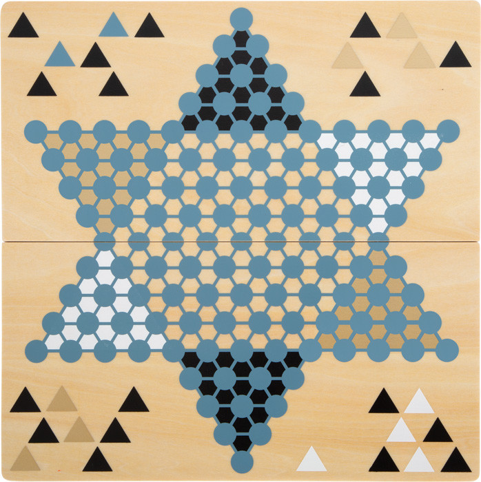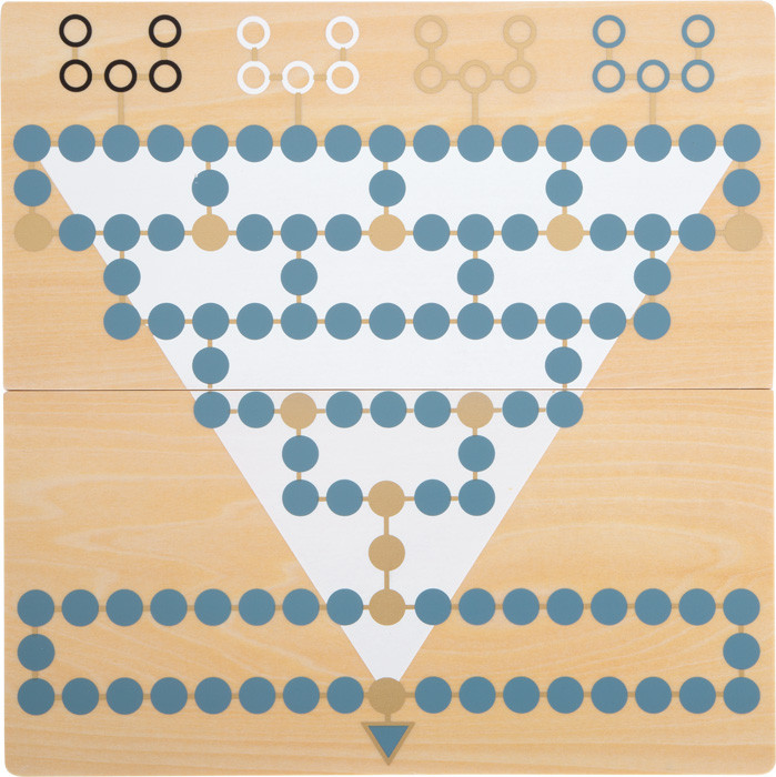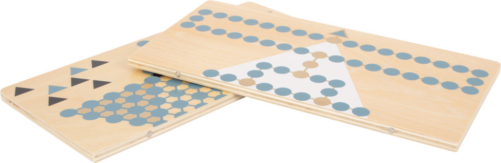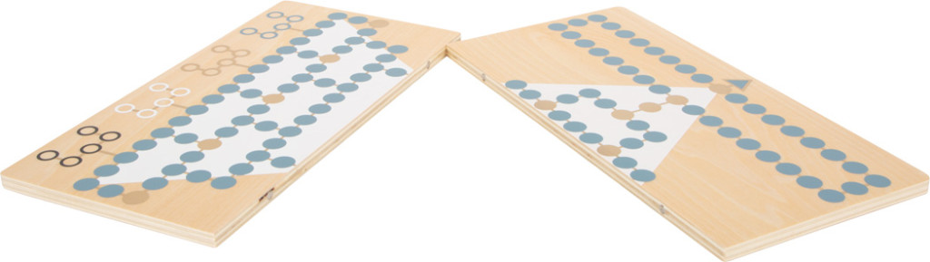 2 az 1-ben fa játéktábla (egyik oldal Halma, másik Barricade), két részből mágnesesen illesztve - helytakarékos. Modern, arany díszítés; a bábuk két játékhoz is használhatók.