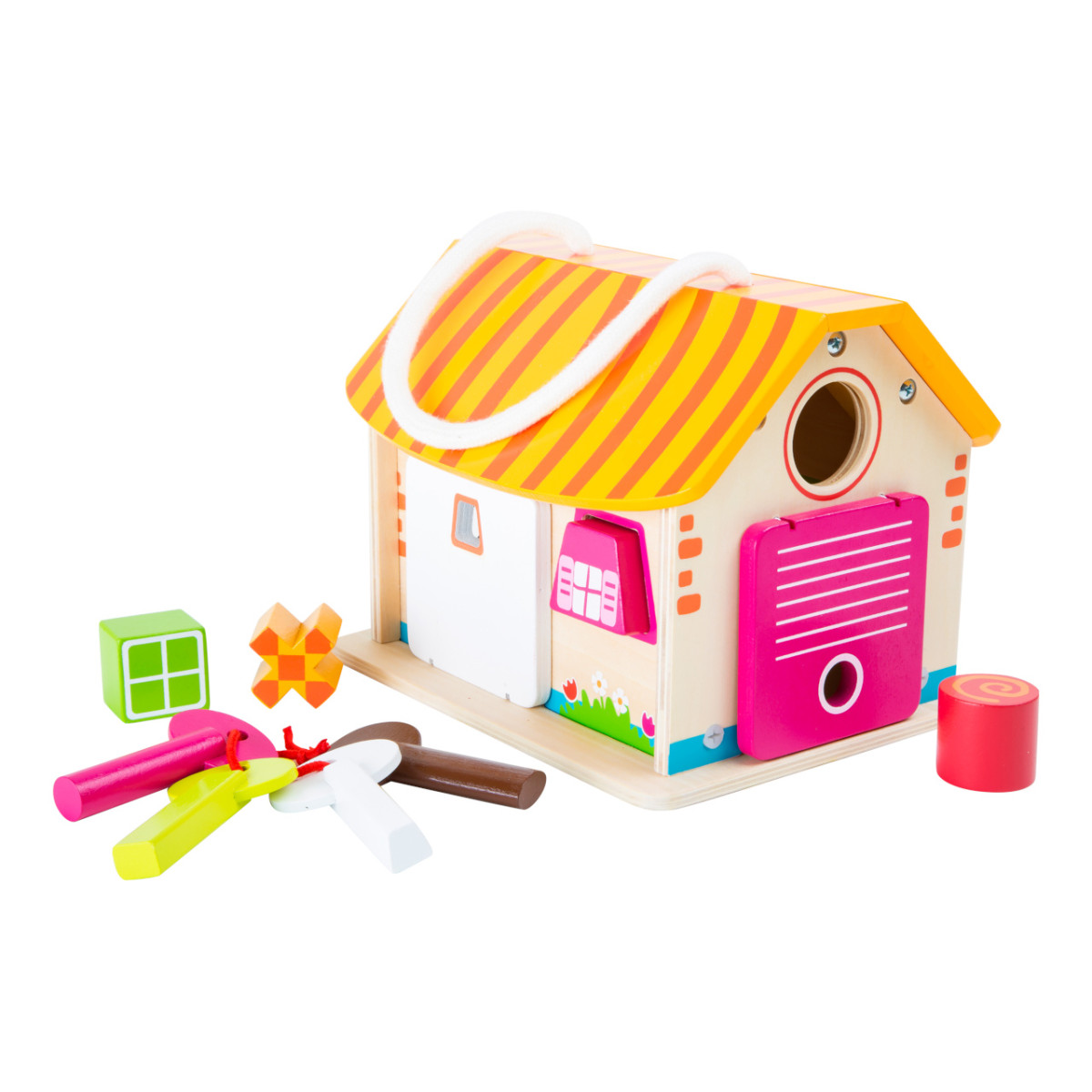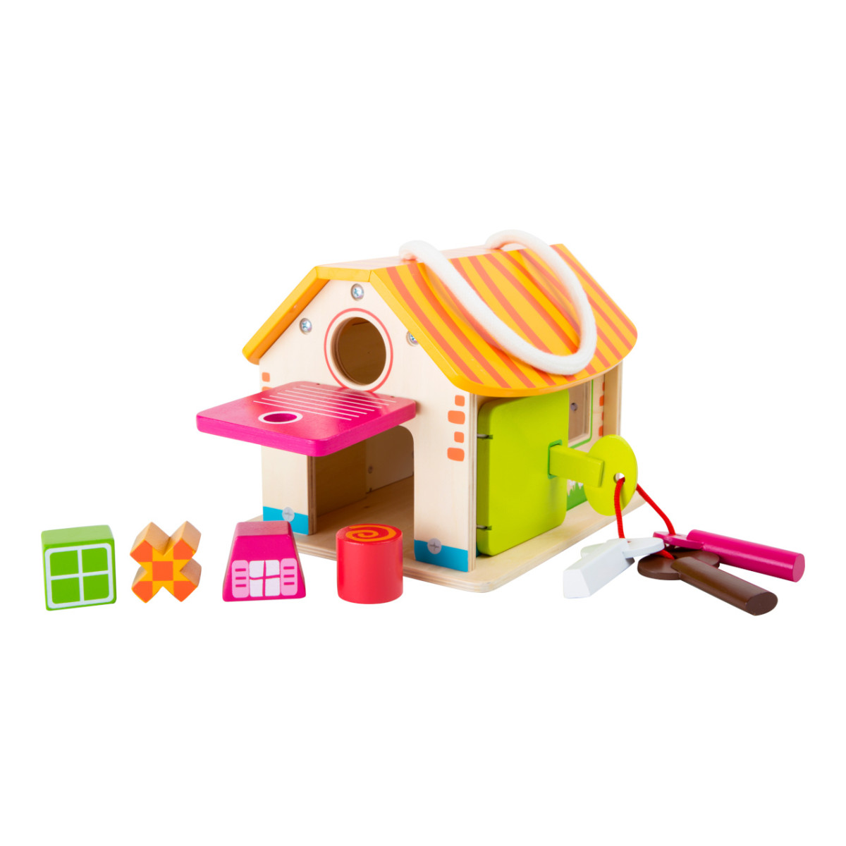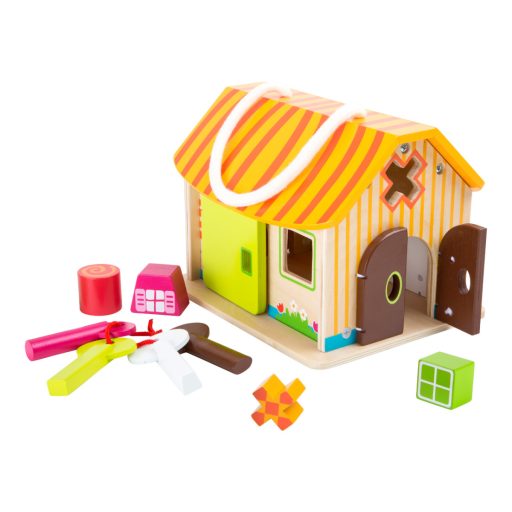 Első pillantásra egyszerű faházikónak tűnik, de valójában izgalmas készségfejlesztő játék! A különböző kulcsok csak a megfelelő ajtókat nyitják, így a gyerekek próbálgathatják a zárakat és a formákat. A gumipántokkal rögzített nyílások és a hordozózsinór még praktikusabbá teszik. Fejleszti a logikát, a türelmet és a finommotorikát, miközben igazi „titkos házikó” élményt nyújt.