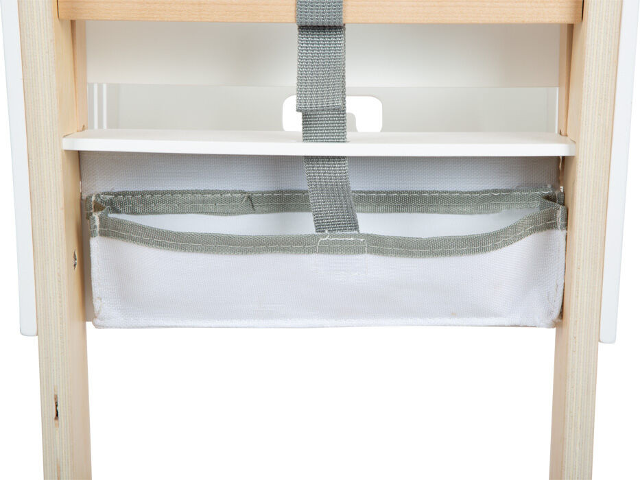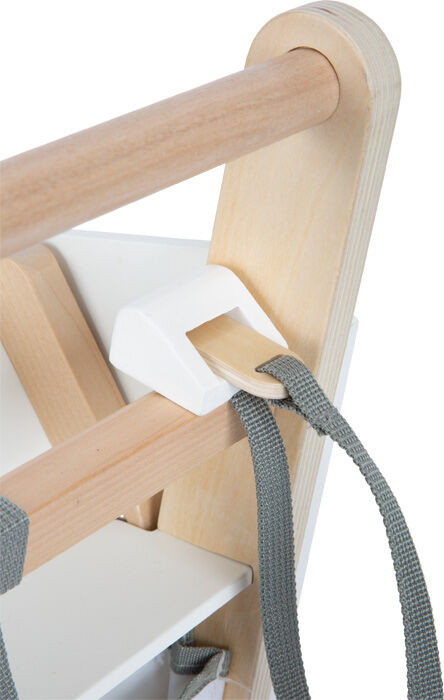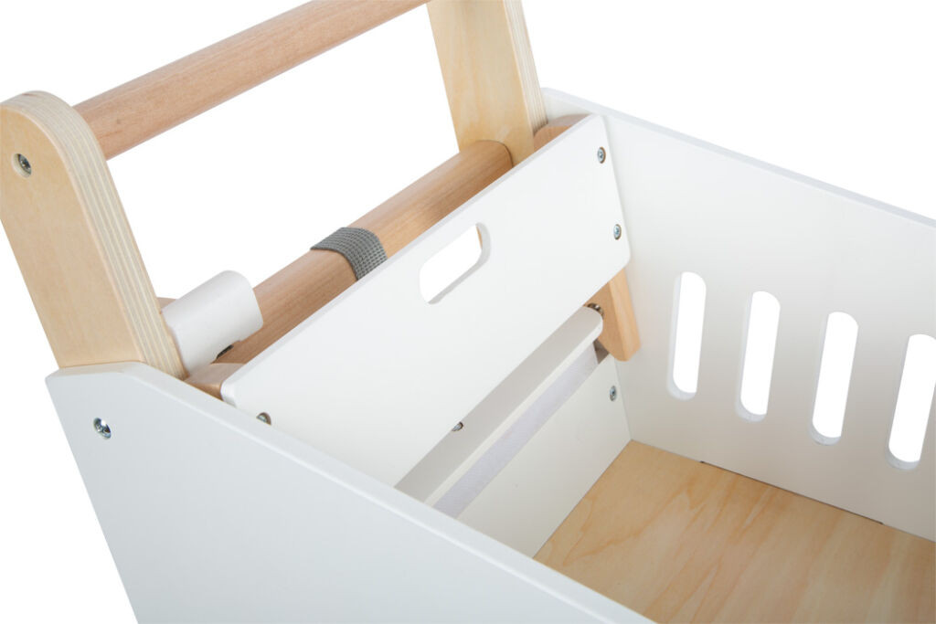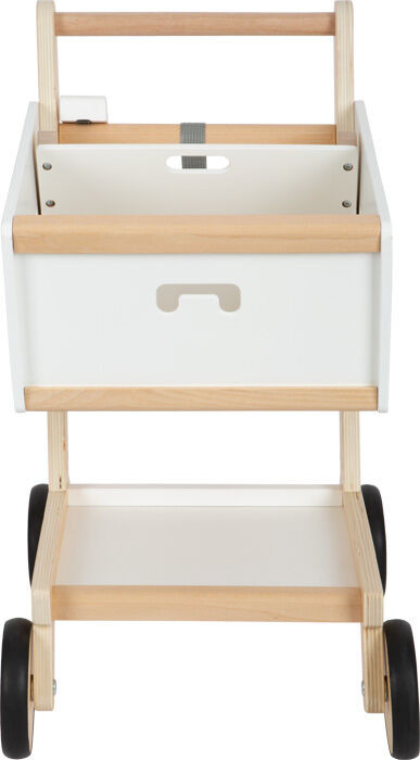 Erős fa bevásárlókocsi gumírozott kerekekkel és mágneses zsetonnal. Nagy kosár, alsó polc rekeszeknek/ládának, lehajtható gyerekülés plüssöknek, elöl táskaakasztó, kis pénztárca-zseb. Halk, nyomot nem hagy; szerepjátékhoz és gyors rendrakáshoz is szuper.