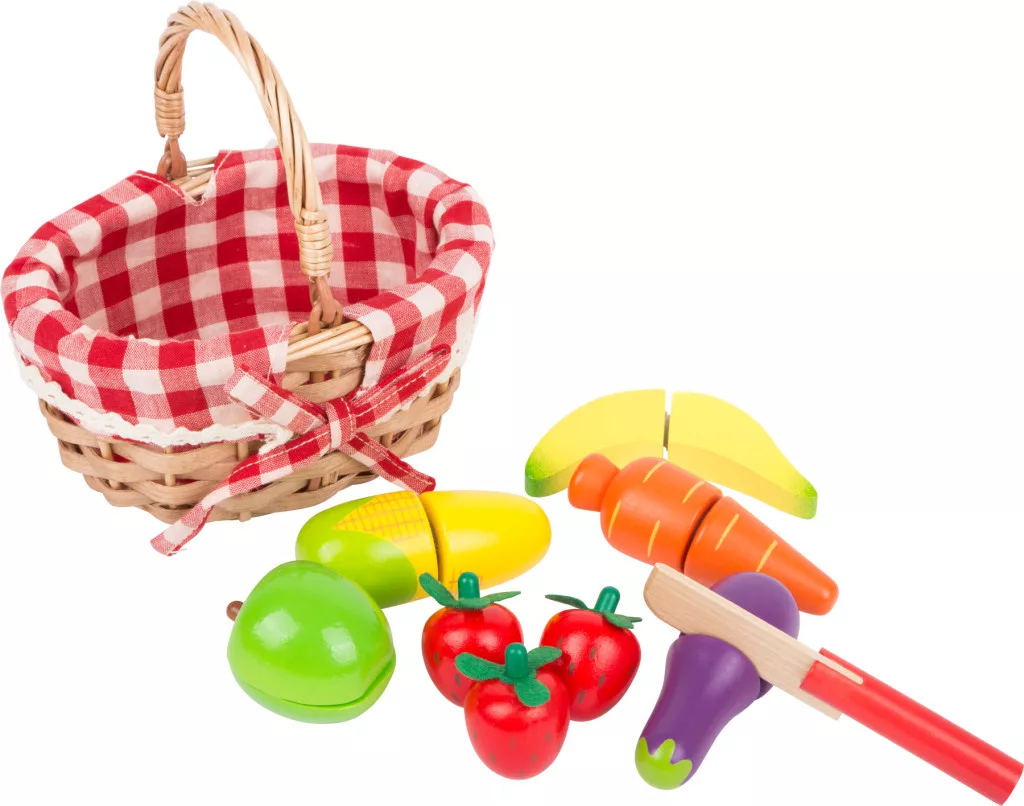 Fonott kosár eperrel, répával, padlizsánnal, kukoricával, almával és banánnal. A tépőzáras darabok a fa késsel „vághatók” - szerepjáték boltba és konyhába, finommotorika-fejlesztéssel.