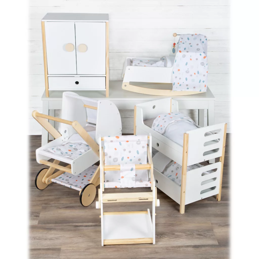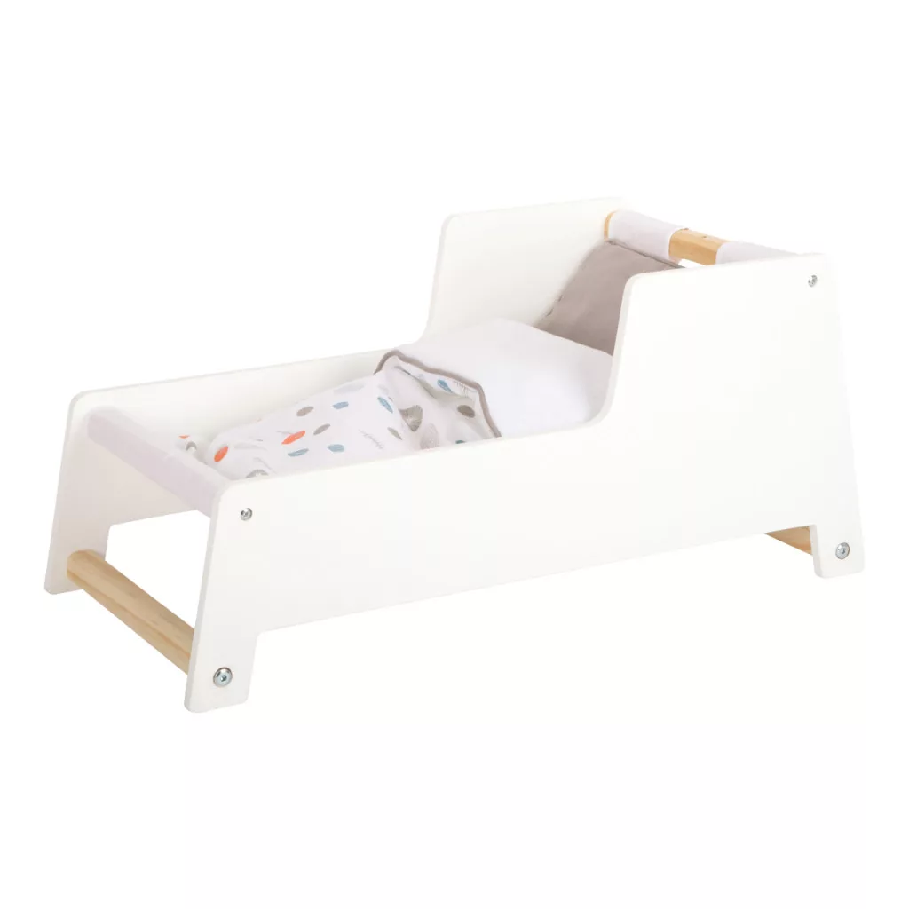 Modern, ringatható fa bölcső mobiljáték-kal és vászon fekvőfelülettel. Levehető talpak és baldachin, megfordítható ágynemű és nagy takaró; 46 cm-es babákhoz.