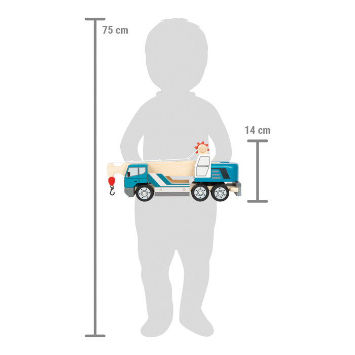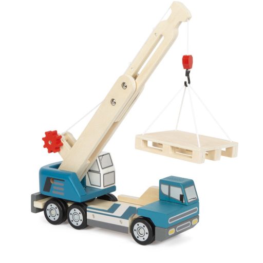 Masszív fa teherautó 360°-ban forgó, kihúzható darukarral és kézi csörlővel. A kampóval könnyen fel- és lerakodhatók a mellékelt raklapra helyezett „terhek”. Gumírozott kerekeken csendesen gurul, stabil felépítése tartós használatot bír. A daruzás fejleszti a kéz-szem koordinációt és a problémamegoldást; önállóan és közösen játszva is remek szerepjáték az építkezés témájában.
