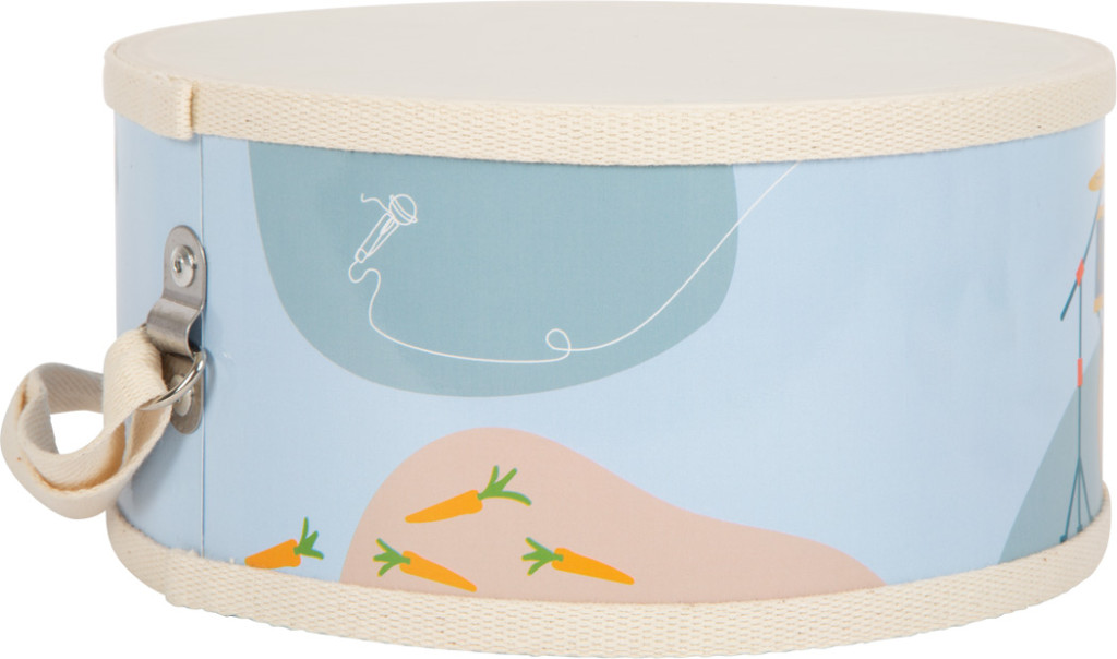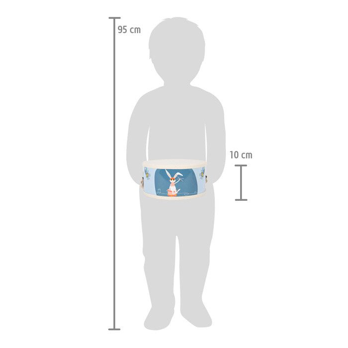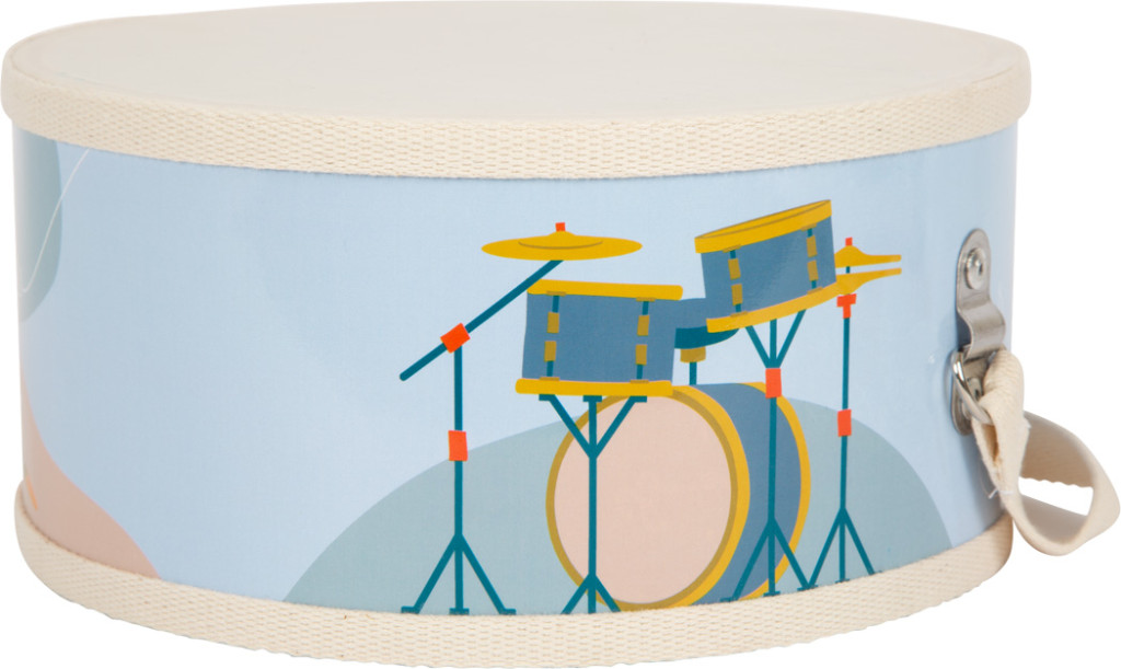 Gyerekdob állítható pamut vállszíjjal, fa dobverőkhöz hangerő-csökkentő kupakokkal. Modern, természetes fa megjelenés; ritmusérzéket és koordinációt tanít.