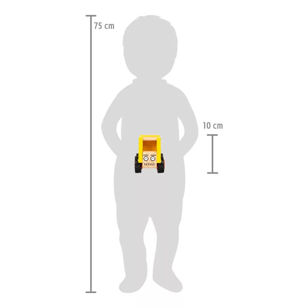 Strapabíró, terepre kész fa mixerautó gumírozott kerekekkel és kézre álló keverődobbal. Könnyen fogható ablaknyílások; kedves „arc”, kreatív építkezős játékhoz.