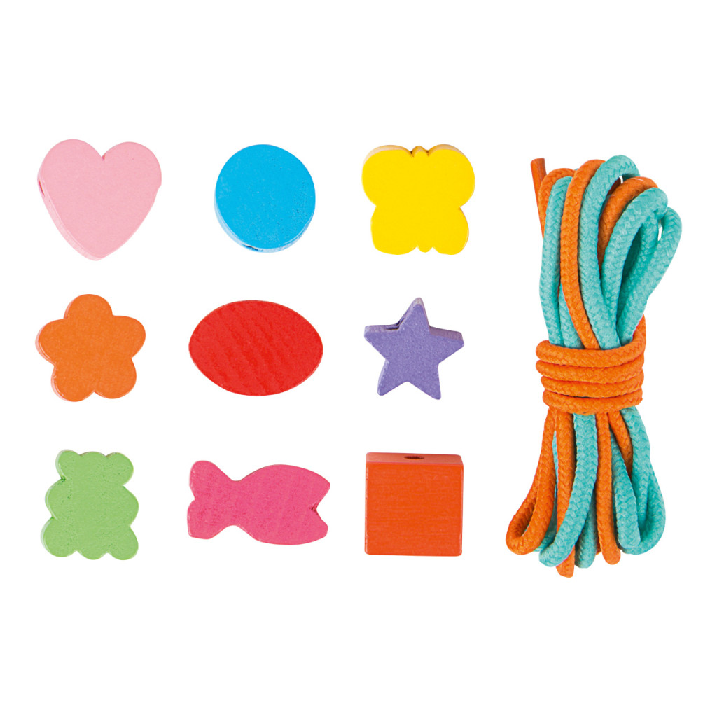 FSC® fa gyöngykészlet (csillagok, szívek, virágok). Ékszerkészítéshez, kézügyesség és szem-kéz koordináció fejlesztésére.