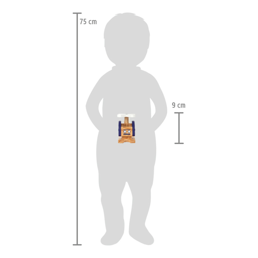 Kompakt, erős fa helikopter forgó rotorral, könnyen megfogható nyílásokkal és vidám „arccal”. Utazós, ajándéknak is remek.