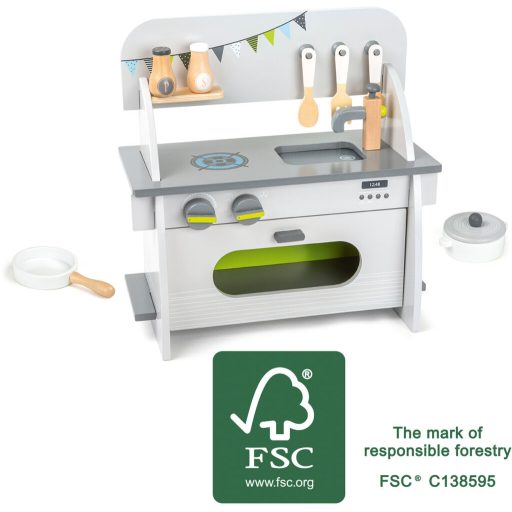 FSC® fa játékkonyha edénnyel, fedővel, só- és borsszóróval. Könnyen össze- és szétszerelhető szerszám nélkül. Valósághű főzős játékhoz.