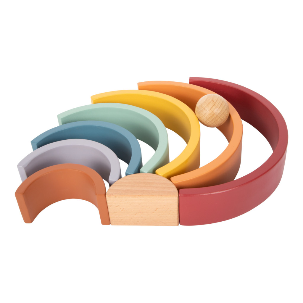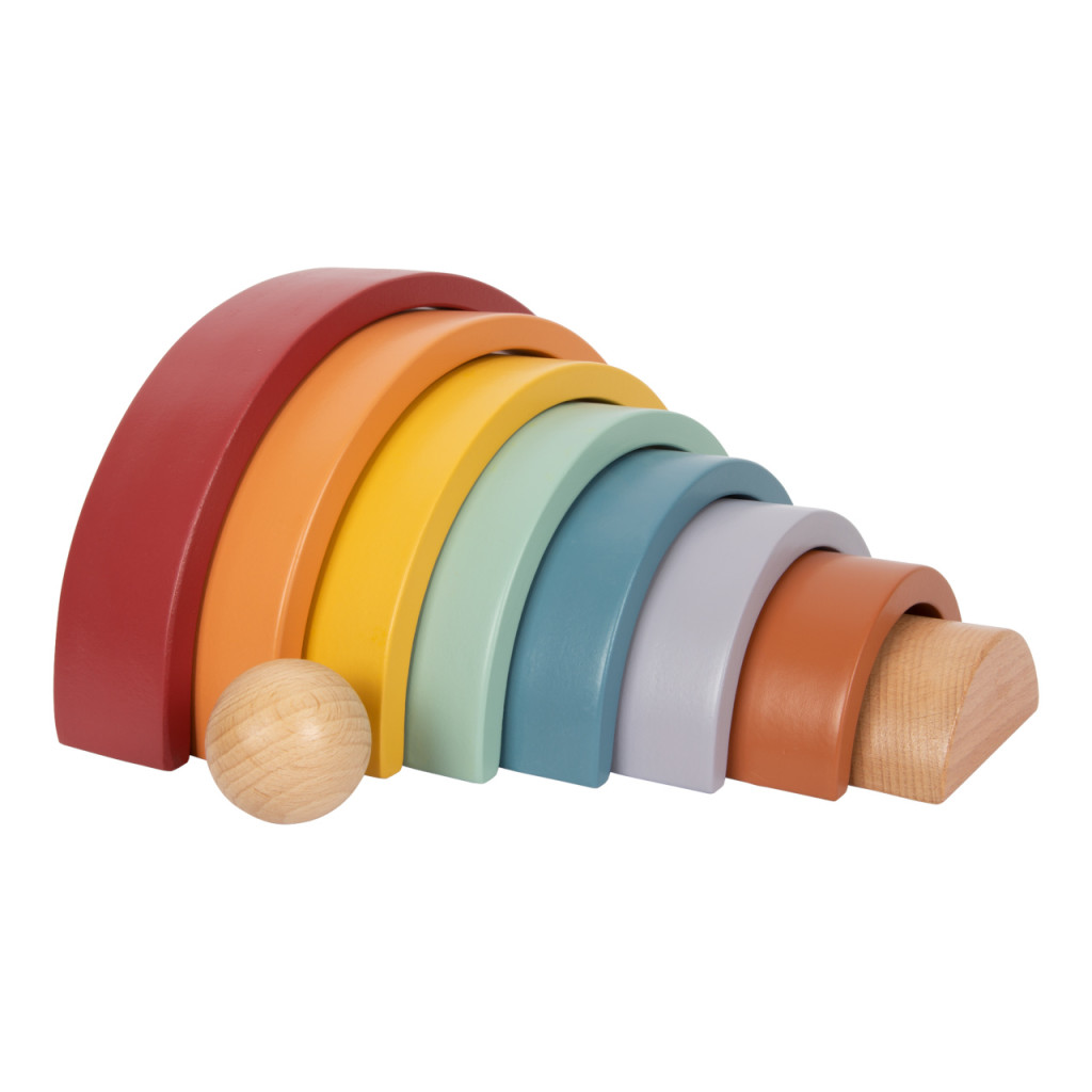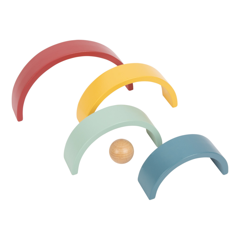 8 db fa szivárványív + fa golyó. Számtalan módon használható (válogatás, építés, rendezés), esztétikus, természetes tapintás; a szabad játék és a színek megismerésének alapdarabja.