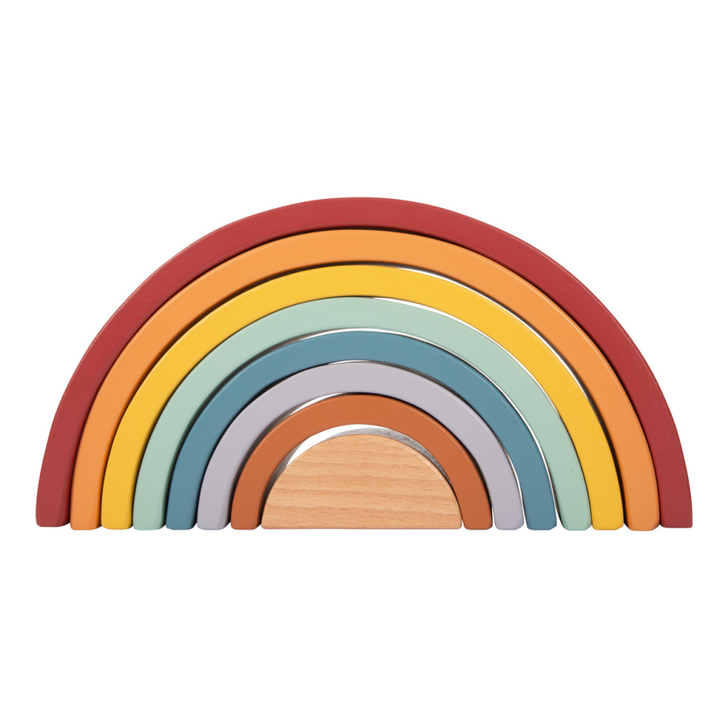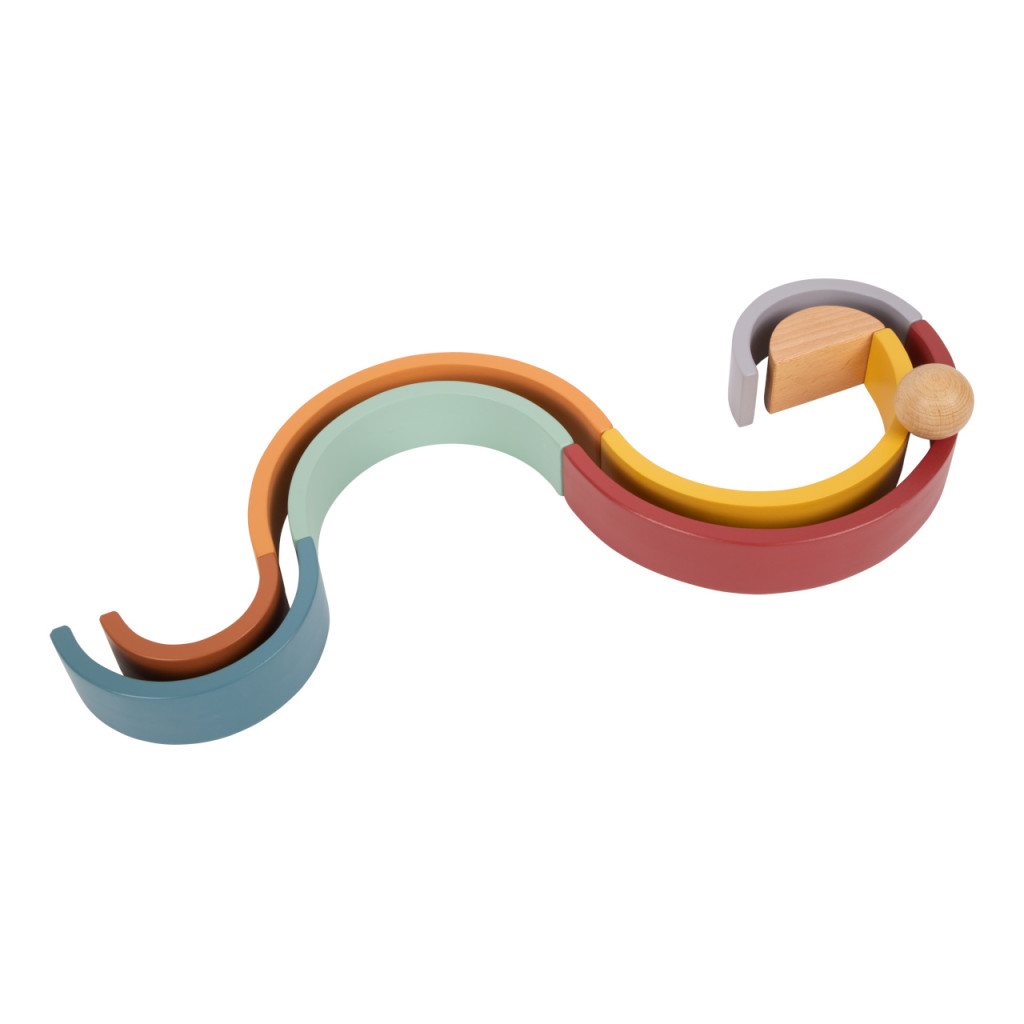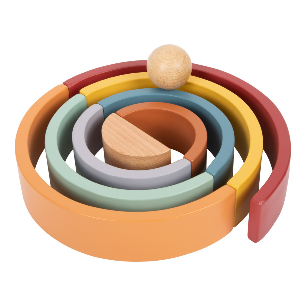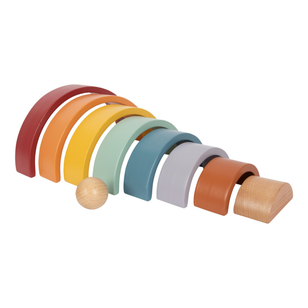 8 db fa szivárványív + fa golyó. Számtalan módon használható (válogatás, építés, rendezés), esztétikus, természetes tapintás; a szabad játék és a színek megismerésének alapdarabja.