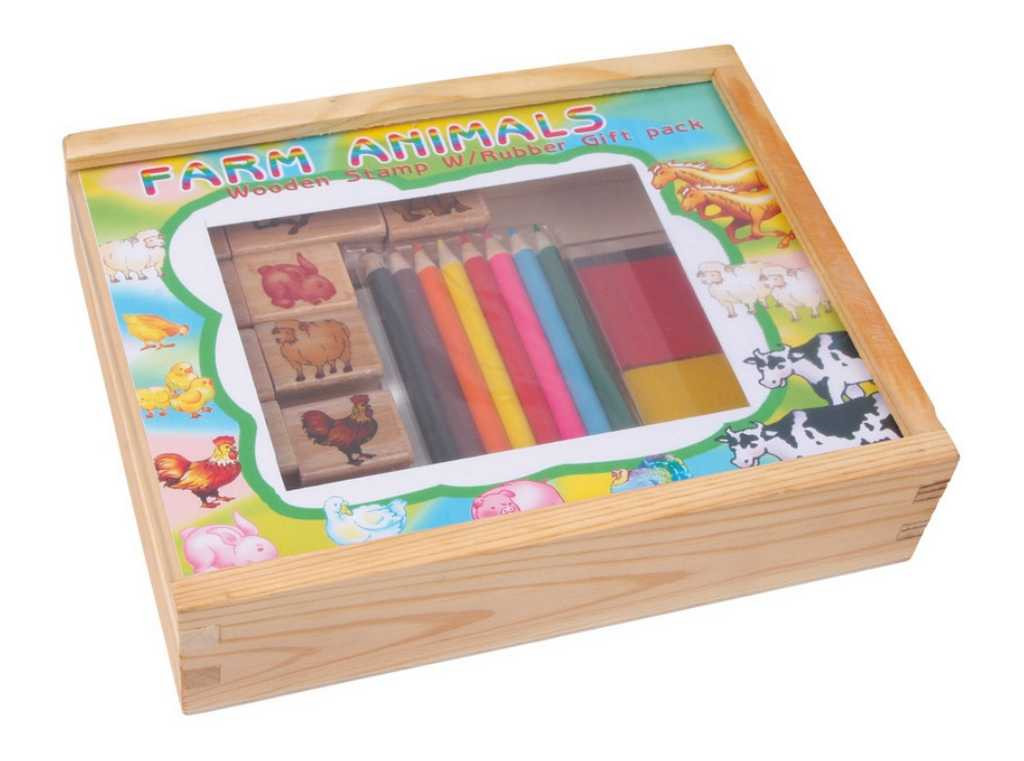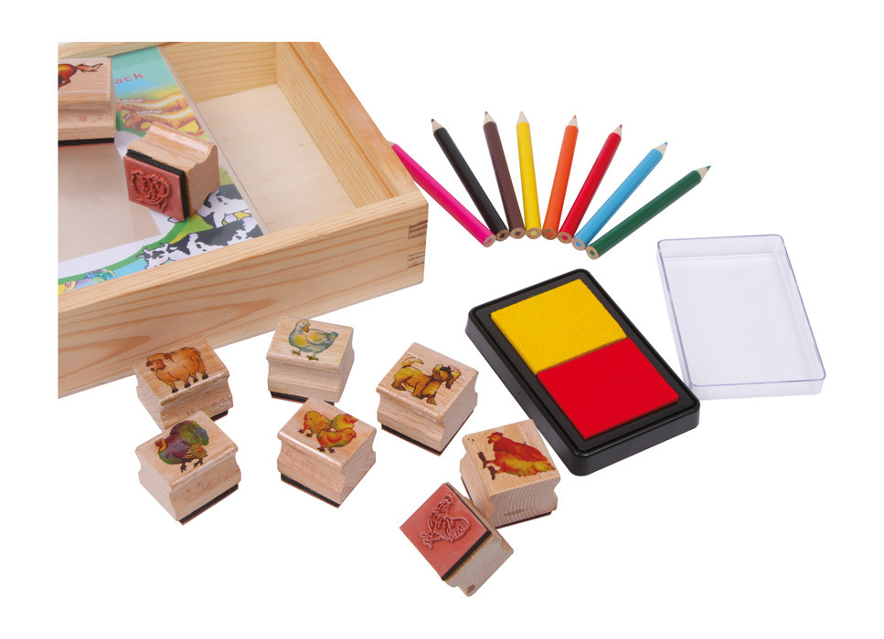 A készlet 9 darab nyomdát, 2 tintapárnát és 8 színes zsírkrétát tartalmaz. A gyerekek papíron kelthetik életre a farm állatait, miközben fejlesztik kreativitásukat és kézügyességüket. A fadobozos, átlátszó fedelű tárolásnak köszönhetően a készlet mindig rendezetten tartható.