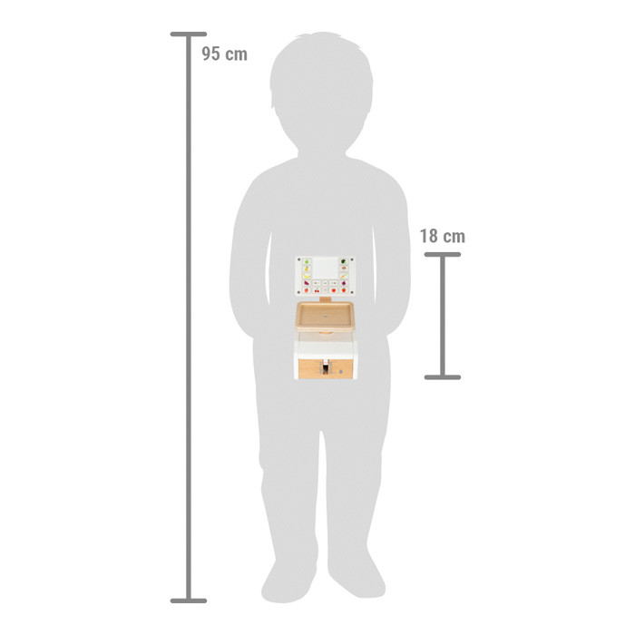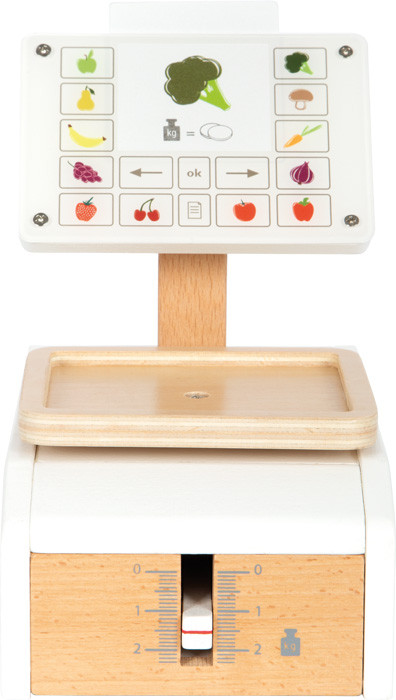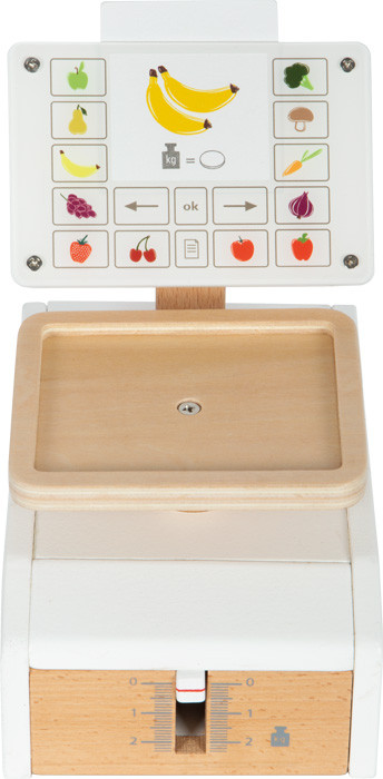 Nagy tálcás fa játék mérleg rugós mechanikával - a kijelző és a tálca mozog a súly szerint. Plexi „monitor”, érintőikonok, zöldség-/gyümölcskártyák (kétoldalas) betolható nyílással. Súly- és ár-fogalom játékos tanítása; masszív kialakítás.