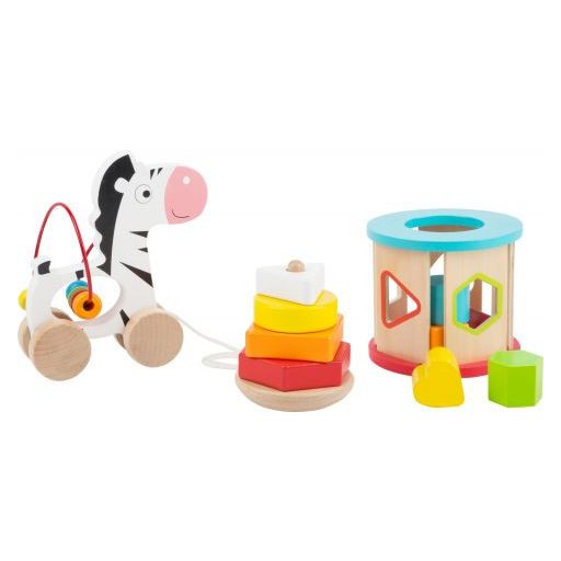Változatos készségfejlesztő fa játék: billegő torony, húzható állat gyöngyspirállal. Finommotorika, ügyesség és koncentráció fejlesztése. Ideális ajándék kisgyermekeknek.