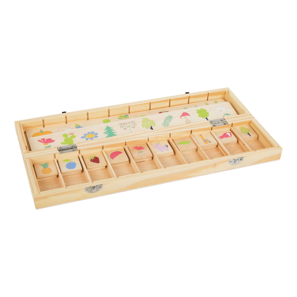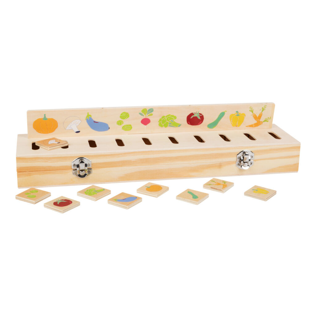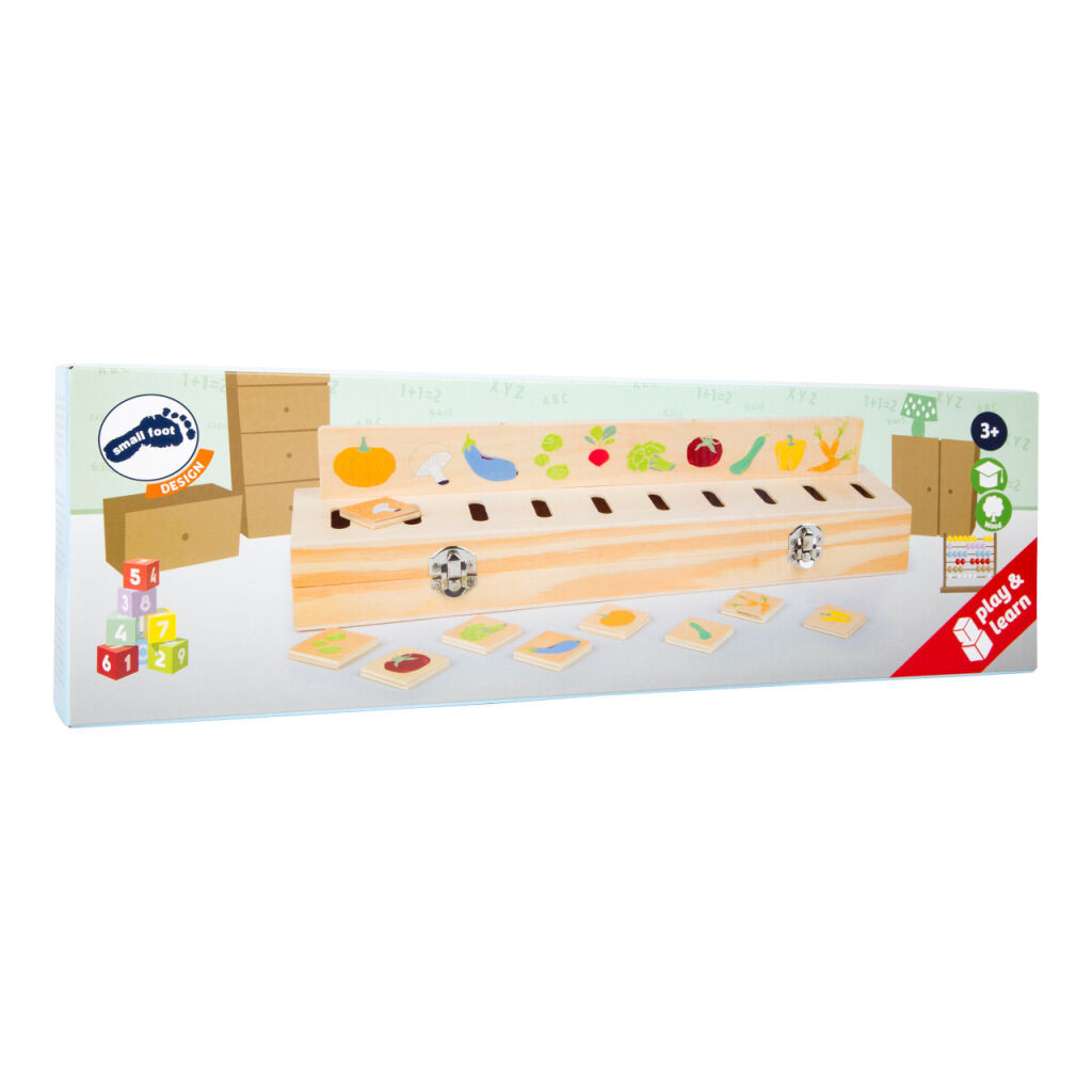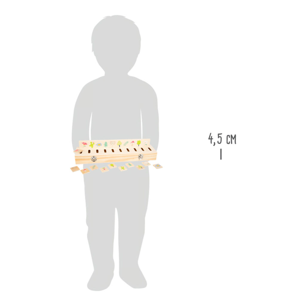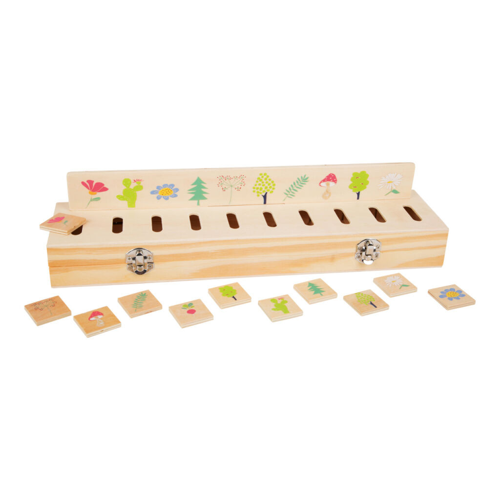 FSC® fa képrendező virág-, gyümölcs- és állatmotívumú csíkokkal. A lapkák a megfelelő helyre csúsztatva eltűnnek a dobozban - rendben tartható játék.