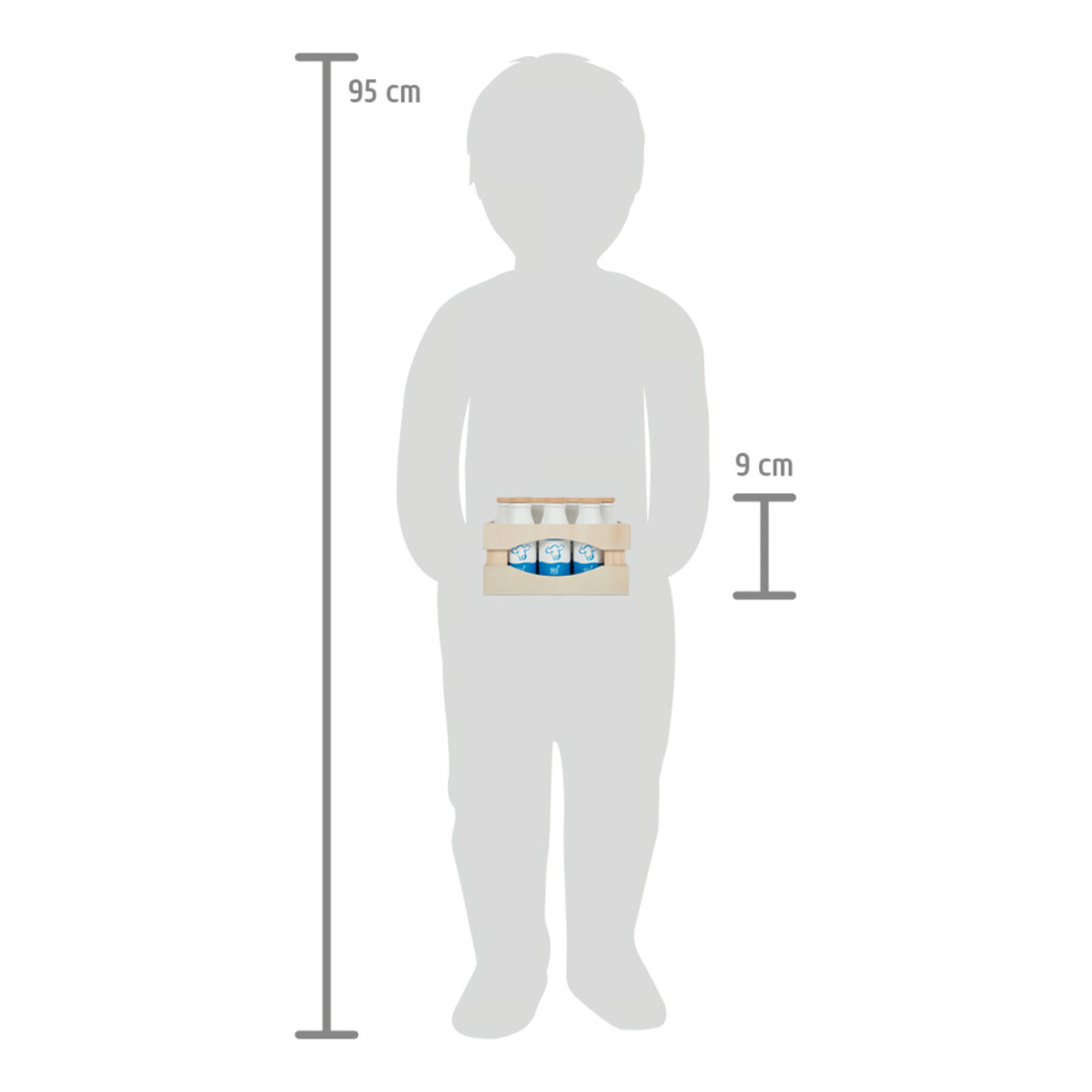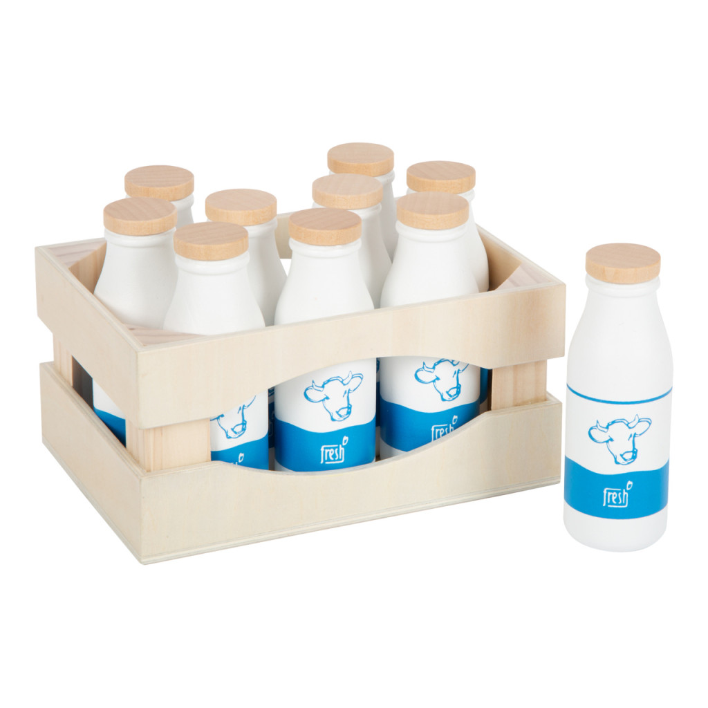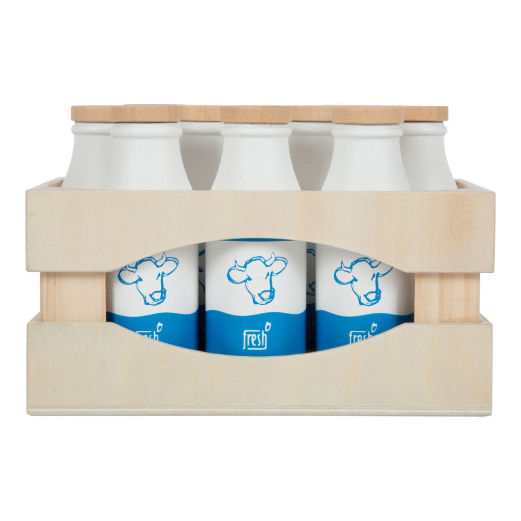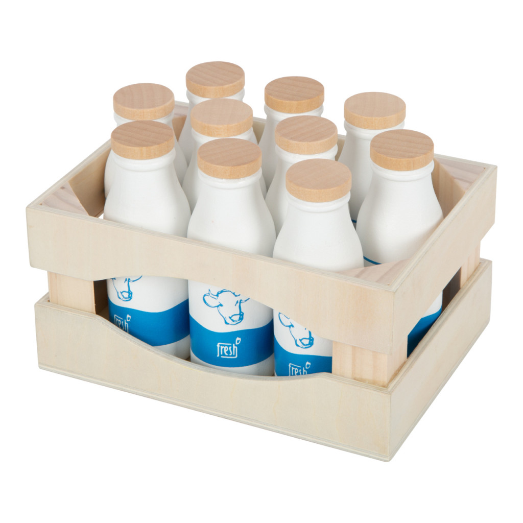 Masszív fa rekesz 10 db tömörfa tejesüveggel. Játékboltba és játékkonyhába; egyszerű piktogramokkal a kicsiknek is érthető. „fresh” italos készletekkel kompatibilis.