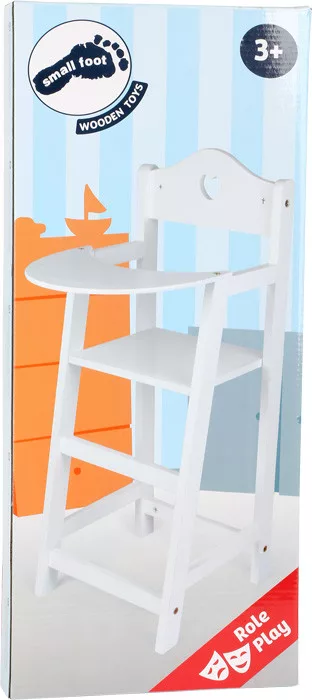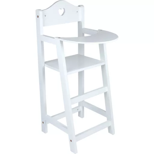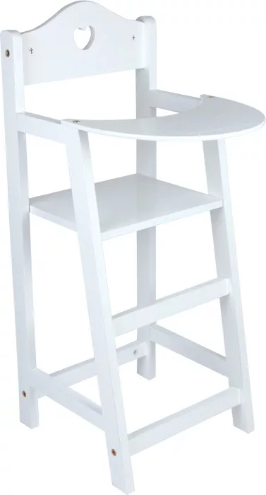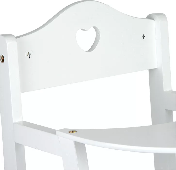 Ez az egyszerű, fehérre festett fa etetőszék szív alakú kivágással dekorálva stílusos kiegészítője a bababútorkészletnek. Letisztult formája miatt bármely gyerekszobában jól mutat. Segíti az aktív szerepjátékot, elősegíti a szociális készségek fejlődését, és elengedhetetlen kelléke minden gondoskodó játékanyukának.