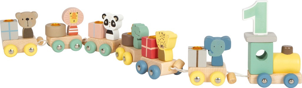 Ünnepi asztaldísz és játék egyben! A színes, hat kocsis fa vonat cuki állatfigurákkal és 1-9-es beszúrható számokkal minden születésnapot különlegessé tesz. A kocsikba 1,5 cm átmérőjű gyertyák helyezhetők a ráadás hangulatért. Tartós, gyerekbarát kialakításának köszönhetően a vonat a mindennapokban is használható - évről évre újra előkerülő, szerethető emlék.