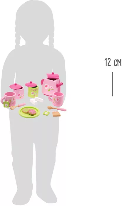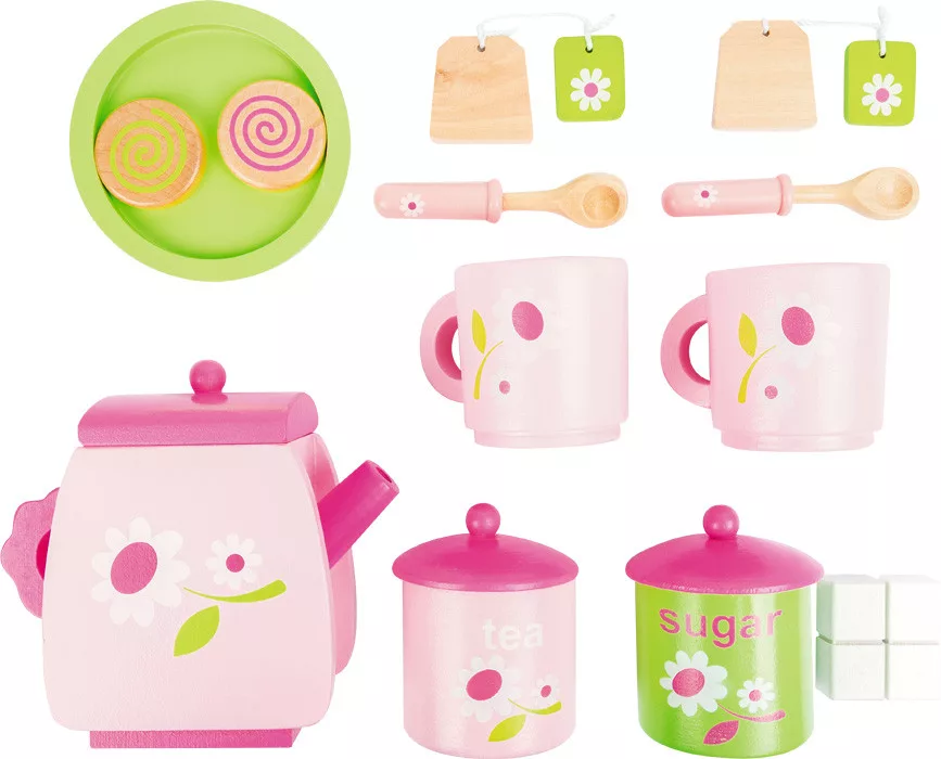 Ez a stílusos, fából készült teaszett mindent tartalmaz egy hangulatos teázáshoz: 2 csésze, teáskanna, cukortartó, bögrék, valamint 2 kanál, 2 teafilter, 2 cukorkocka és egy tálca finom kekszekkel. A rózsaszín és zöld színek vidám hangulatot árasztanak, így a szerepjáték során a gyerekek igazi kis teadélutánt rendezhetnek.