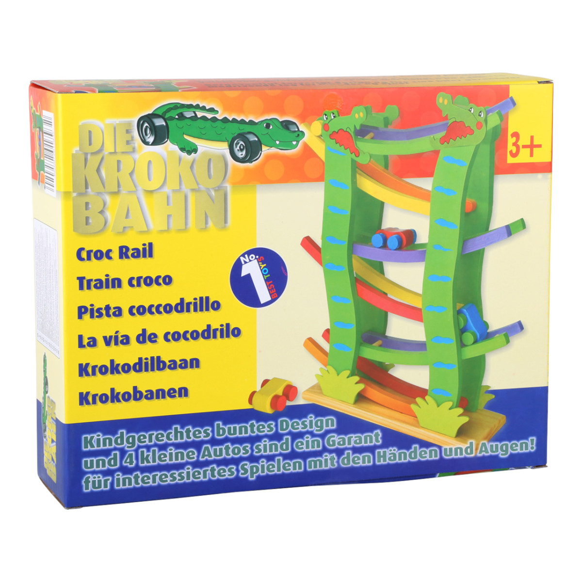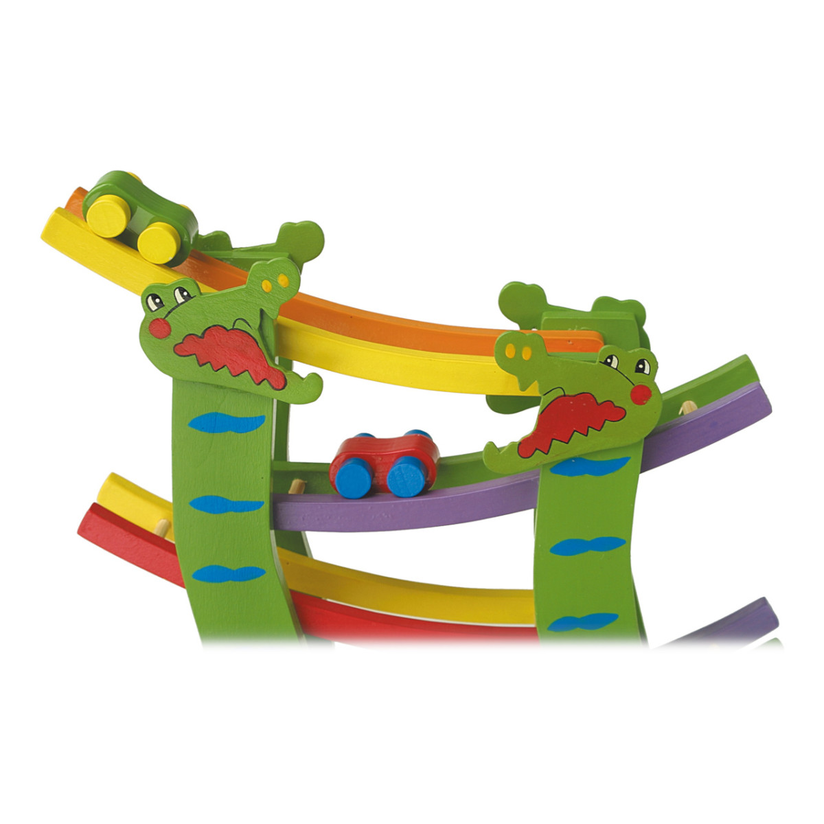 Ez az izgalmas fa versenypálya krokodilfejes pályával garantálja a gyorsasági élményt! A 4 mellékelt faautó a pálya tetejéről indul, majd a rámpán átfordulva az alsó sínre érkezik, és újra indulhat a verseny. Gyors, látványos és szórakoztató játék, amely újra és újra leköti a gyerekeket.