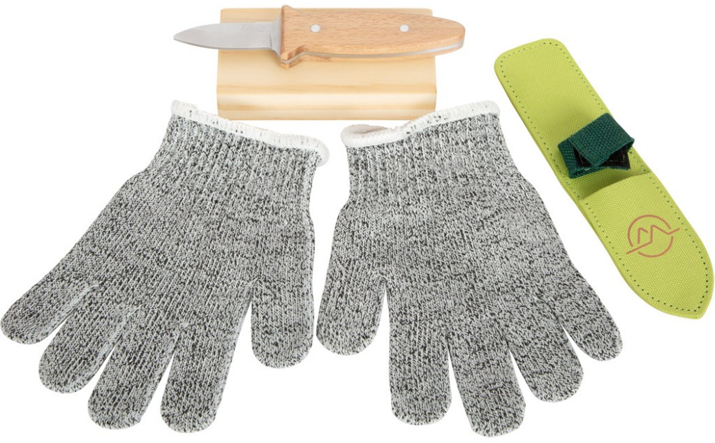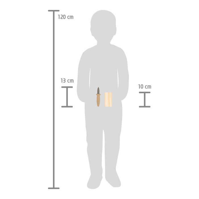 Gyerekeknek kialakított kültéri faragókés tompa heggyel, rövid, éles pengével; erős textil tok övhurkokkal, vágásbiztos kesztyűpár és fa vágódeszka. Csak felnőtt felügyelettel használható; túrához, tábortűzhöz ideális.