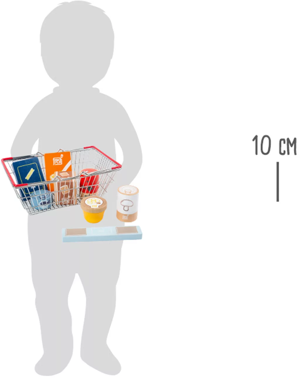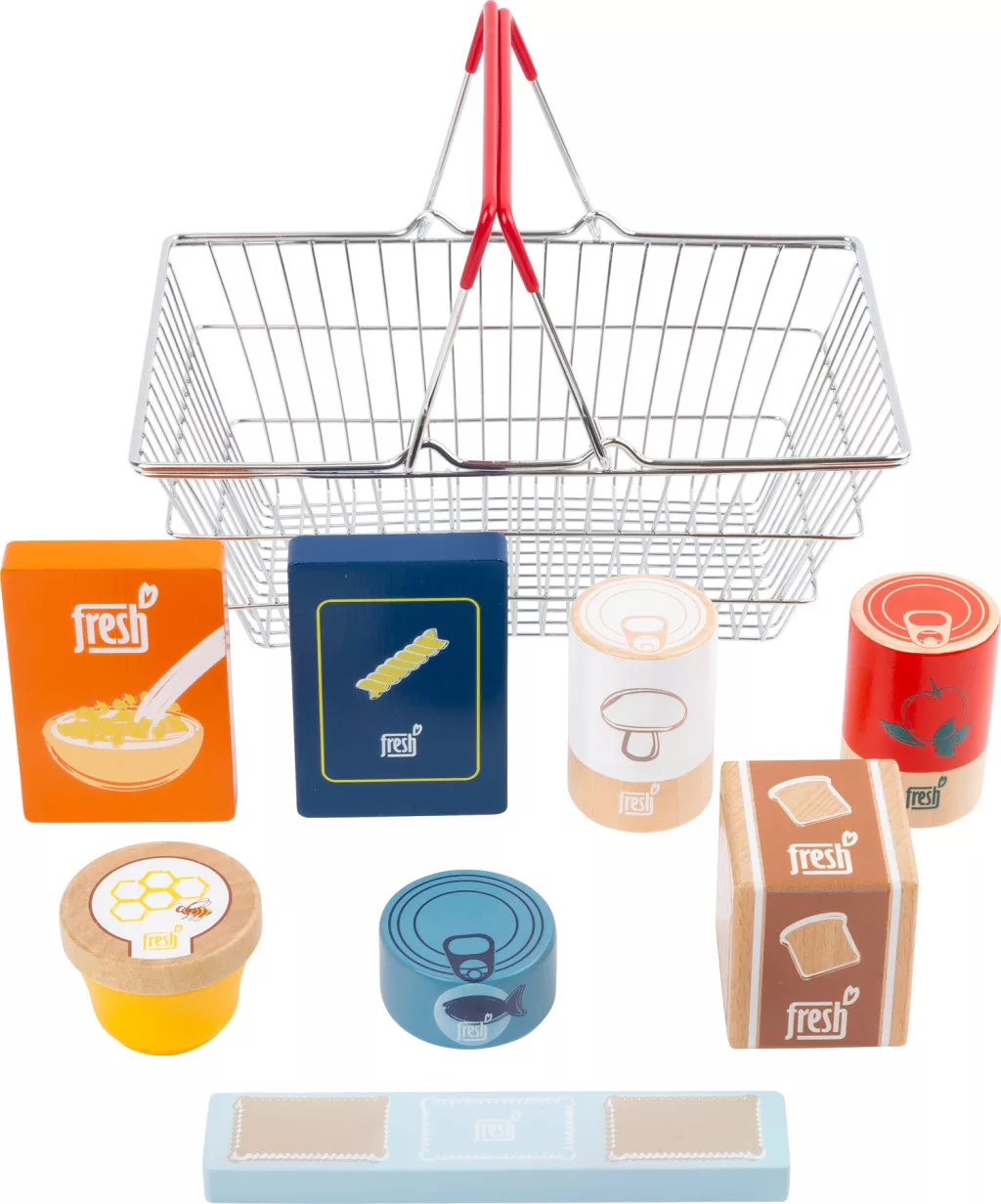 9 darab fa élelmiszer: teljes kiőrlésű kenyér, corn flakes, tészta, tonhal, paradicsomszósz, gomba, méz, keksz. Fém kosár tartozékkal.