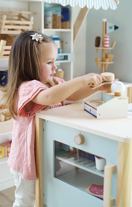 • Babakonyhák és szerepjátékok: részletgazdag fa játékkonyhák, elárusítópultok, kávéfőzők és háztartási eszközök, amelyek a gyerekek kreatív szerepjátékait teszik valóságossá.