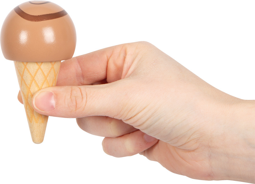 Két gombóc, két tölcsér és mágneses fagyiskanál. A gombócok rekeszből kivehetők és a tölcsérre/egymásra rakhatók; a kanál gombnyomásra „elengedi” a gombócot. FSC® fa, sok látható fa, minimál dizájn - kis konyhákhoz is.