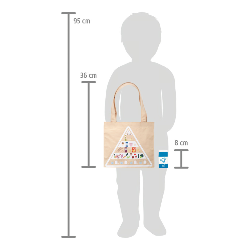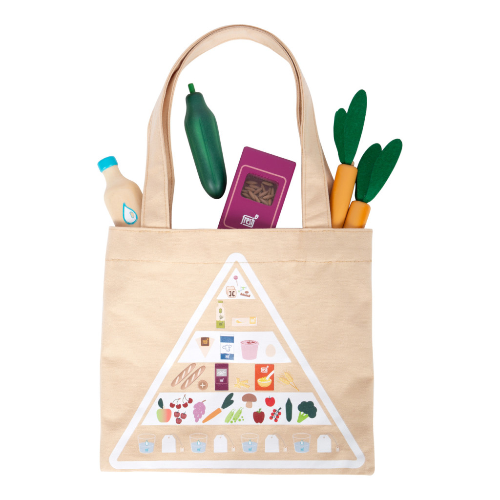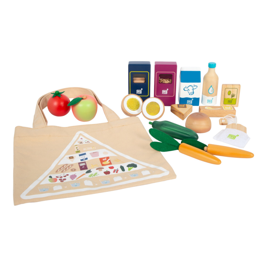 Átfogó fa élelmiszerkészlet (tej, vaj, sajt, olaj, tojás, rizs, tészta, kenyér, alma, paradicsom, uborka, répa, víz, tea). Rizs/tészta csomagolás plexiablakkal és zörgő tartalommal; pamut bevásárlótáskával.