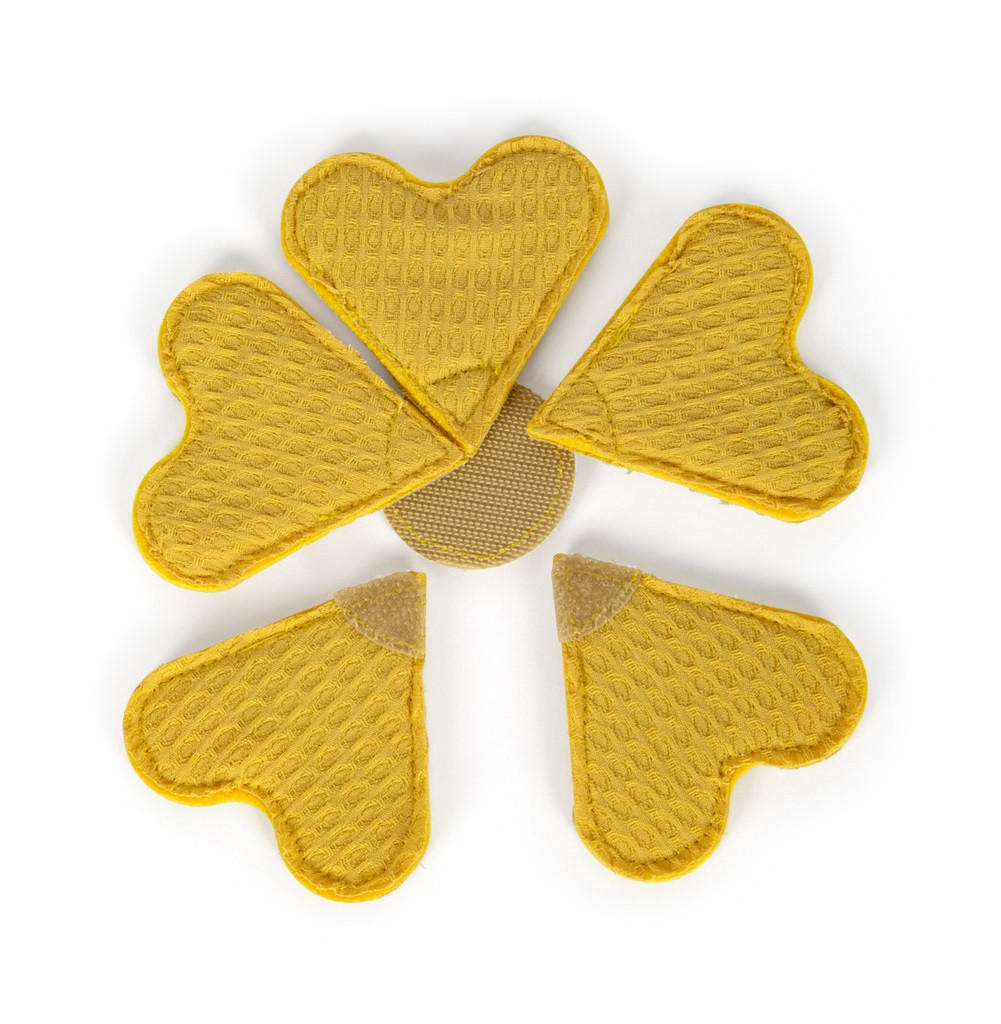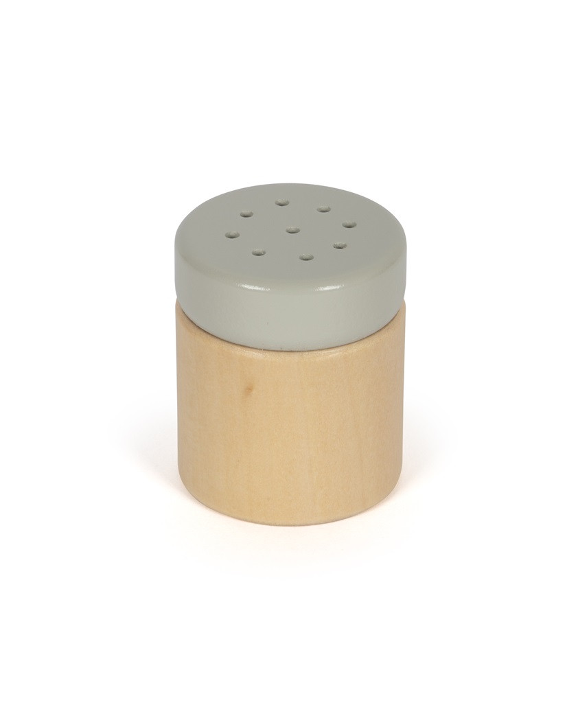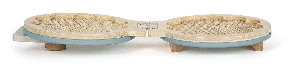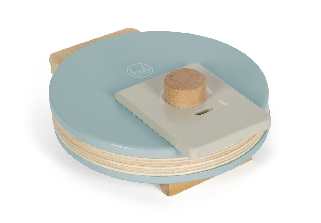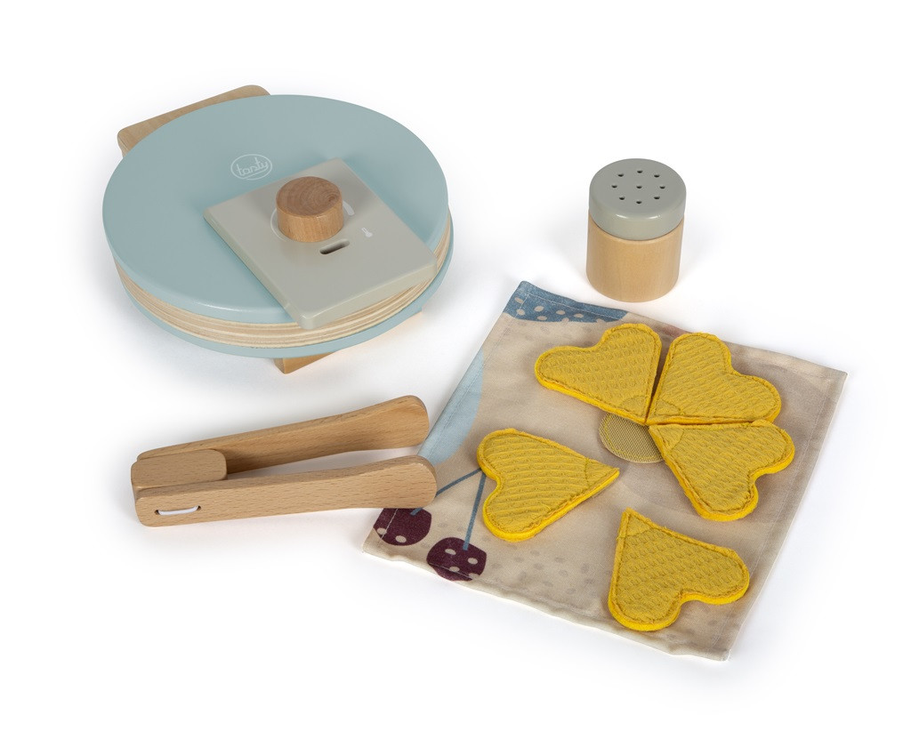 Tekerőgomb (piros-zöld), fa csipesz, „porcukorszóró” rázóhanggal. Szív alakú textil gofri 5 kis szívre szedhető tépőzárral. Szerepjátékhoz, modern skandináv színekben.