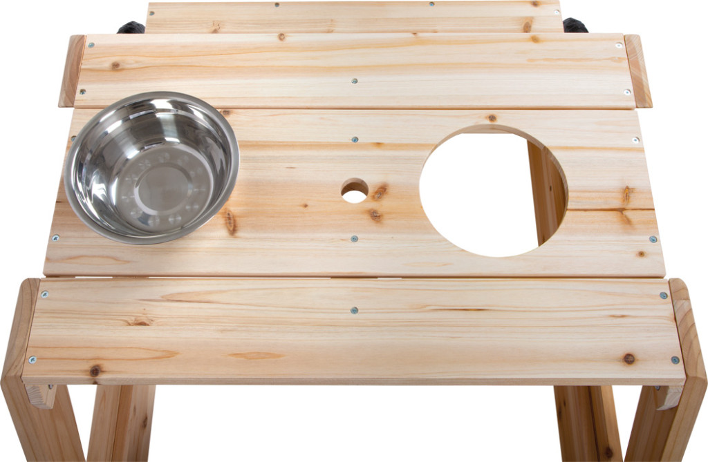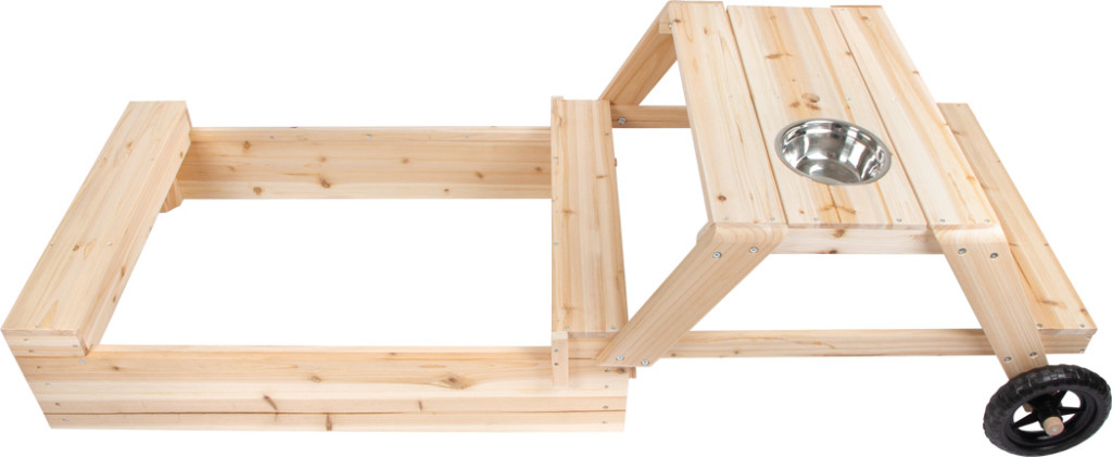 Robusztus, kezeletlen fa. Felcsúsztatva egyszerre használható a homokozórész és a gyerek ülősarok asztallal; kivehető fémmedencéből sárasztal lesz. Napernyőnyílás, gurítható kerekek, csúcskategóriás fedőponyva rögzítésekkel. Teraszra, erkélyre, kis kertbe.