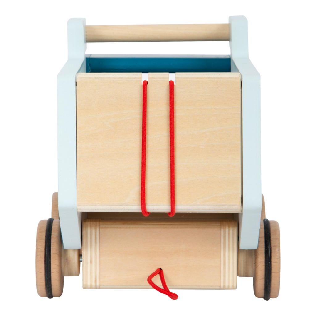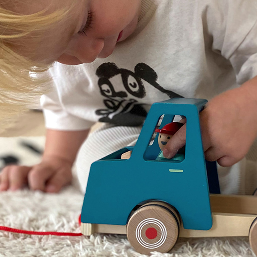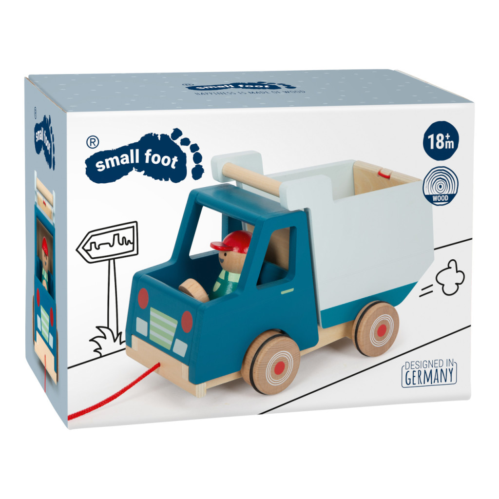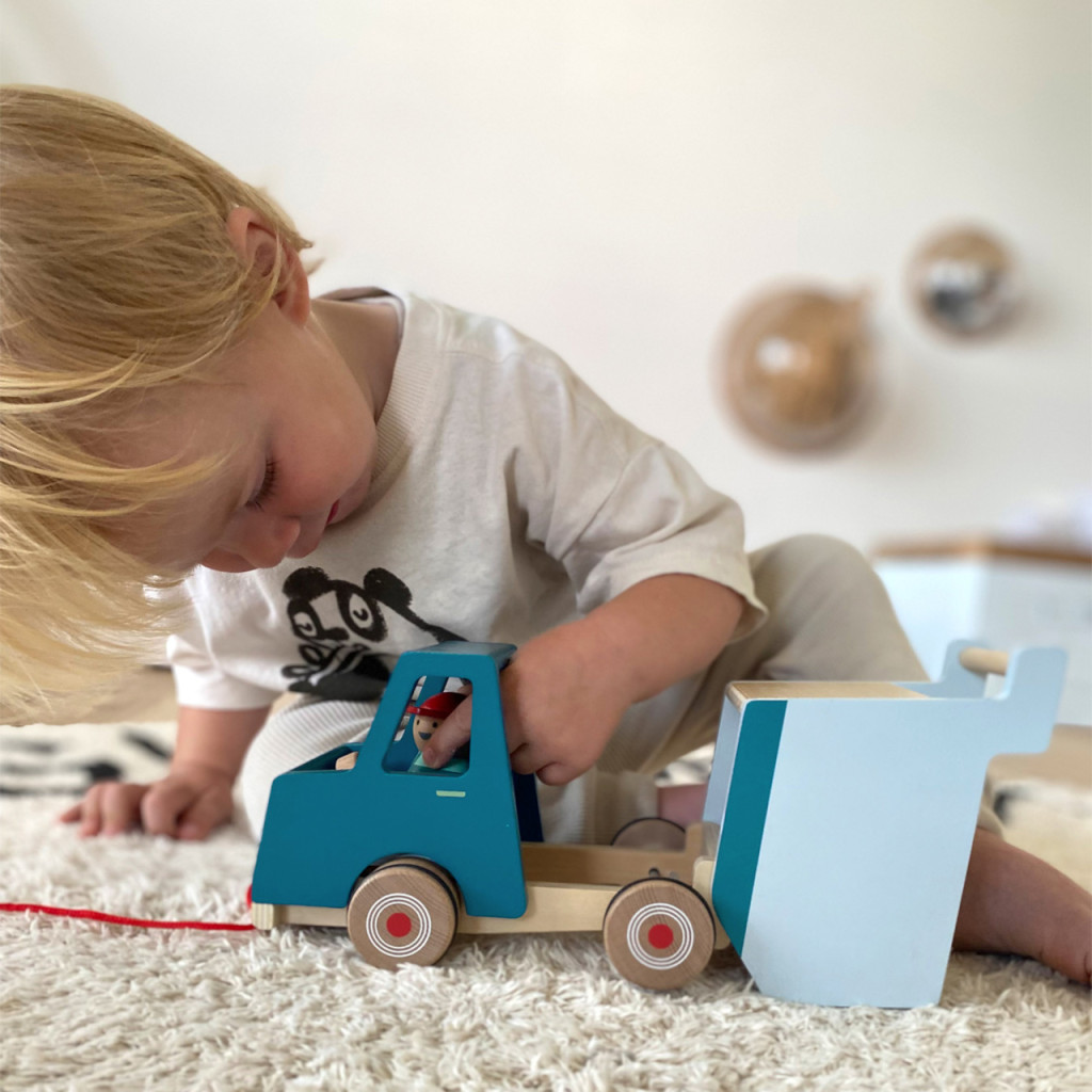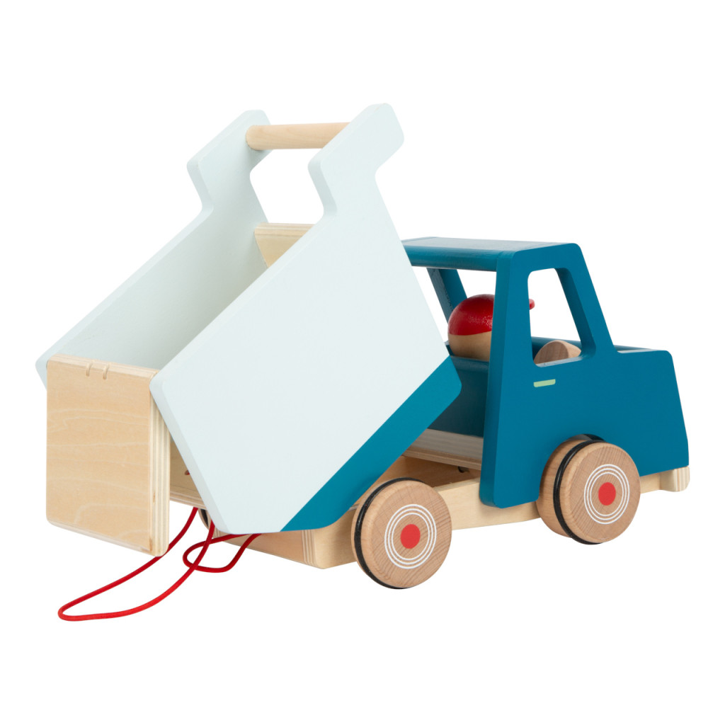 Masszív fa teherautó billenőplatóval és gumírozott kerekekkel. Tolható, húzható és hagyományos játékként is használható; a rugós/elasztikus elem és az ugráló vezető látvány- és hangeffektekkel szórakoztat, miközben fejleszti a finommotorikát és a járást.