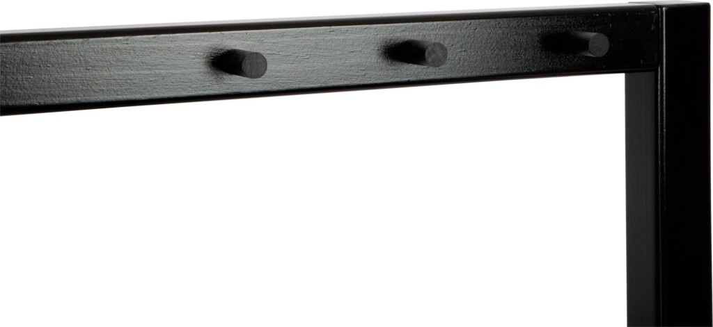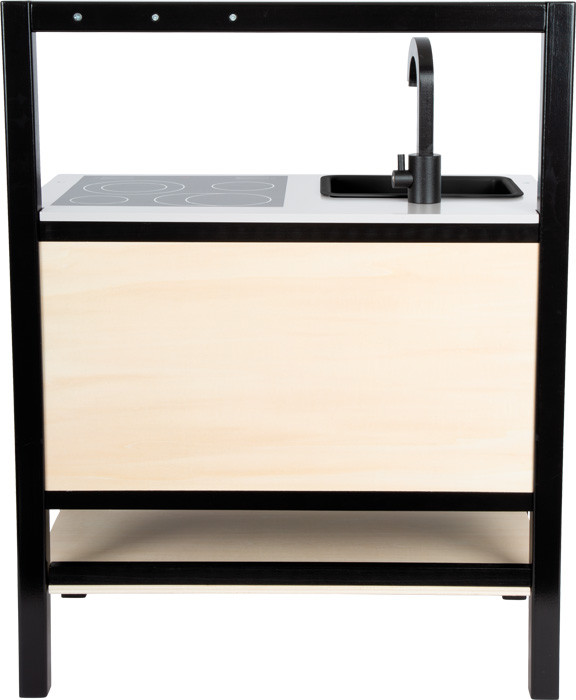 Moduláris, fekete keretes design. Mozgatható csap, kivehető mosdótál, sütő tepsivel, kattogó gombok, ábrázolt készülékek. Serpenyő, lábas, spatula, fogó a készletben; polcok és akasztók.