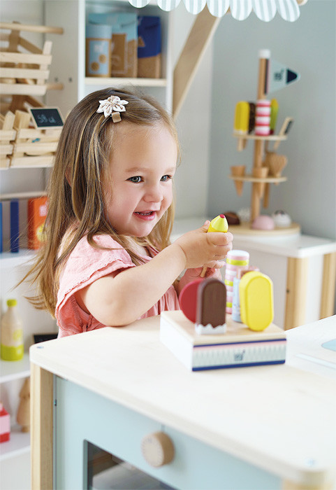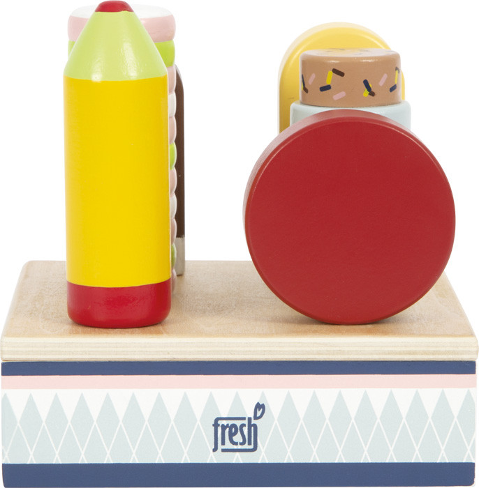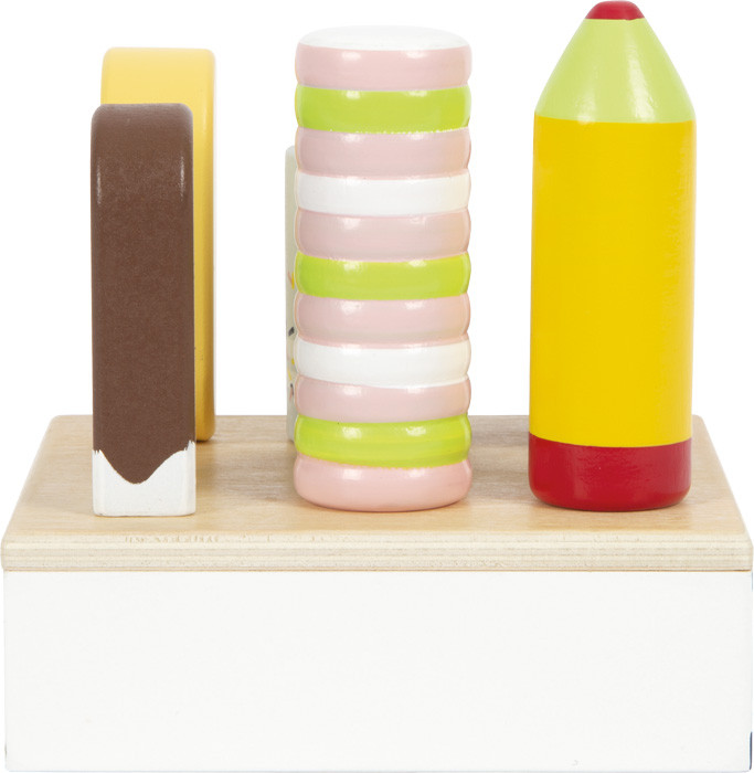 6-féle fa pálcikás jégkrém tartóállvánnyal. Letisztult, természetes fa megjelenés, élénk „klasszikus” színek. Boltos/jégkrémes szerepjátékhoz; arányai a 12416 Kompakt fagylaltpulthoz illeszkednek.