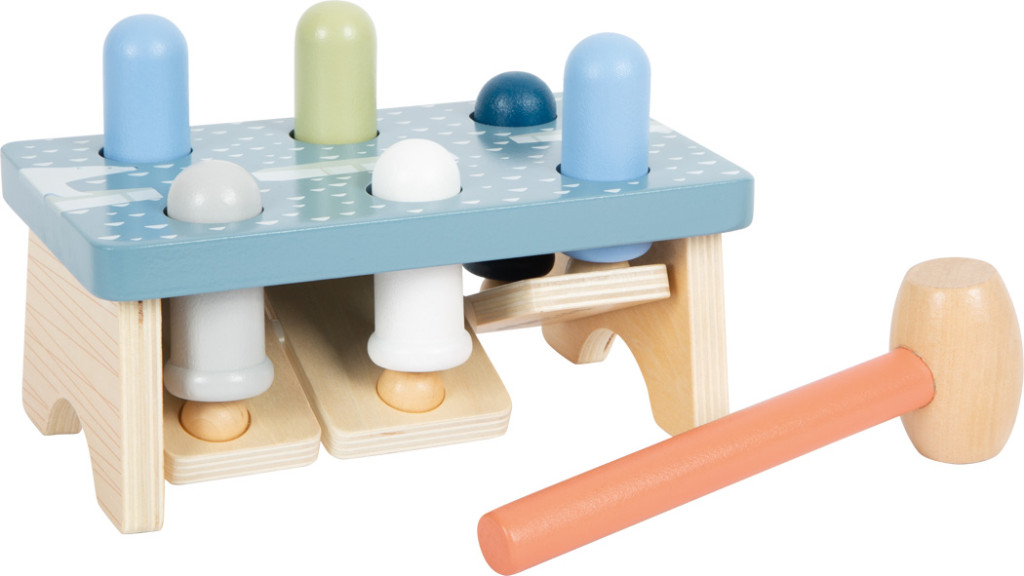 Klasszikus kalapáló pad FSC® fából. Ha az egyik rúd lemegy, a szemközti felpattan - látványos ok-okozat élmény. Koordinációt és finommotorikát fejleszt; lágy, „Arctic” színek.