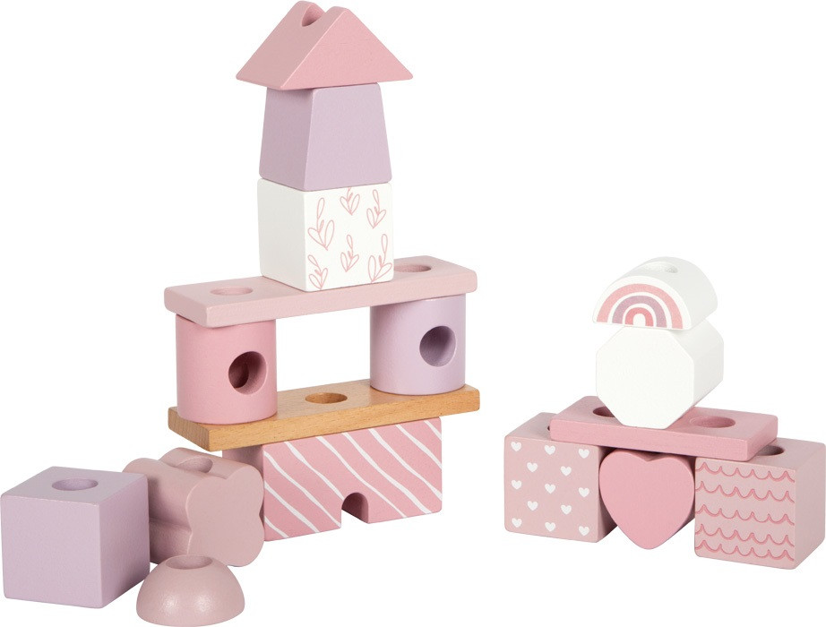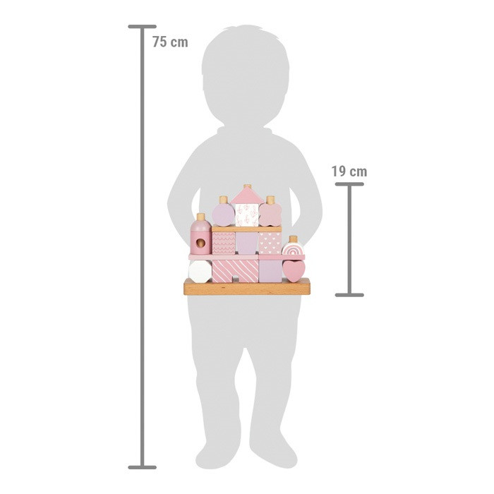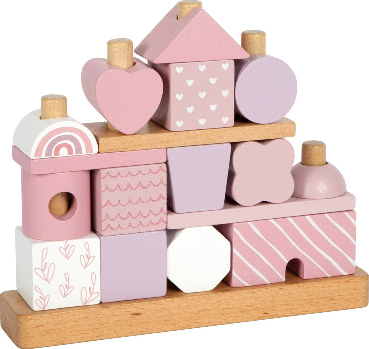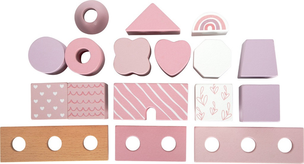 A kék változathoz hasonlóan 18 darab, változatos formájú és mintájú kockával érkezik, pasztell rózsaszín-fehér-natúr árnyalatokban. Sokáig leköti a figyelmet, fejleszti a kreativitást és térlátást, miközben ízléses kiegészítője a gyerekszobának.