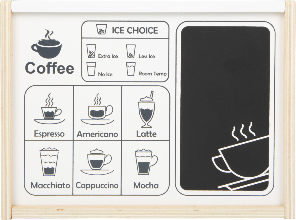 Valósághű fa kávégép tejhabosítóval, kattogó gombokkal, mozgó szűrővel és átlátszó poharakkal. Hátoldalán írótábla; szerepjátékhoz ideális.