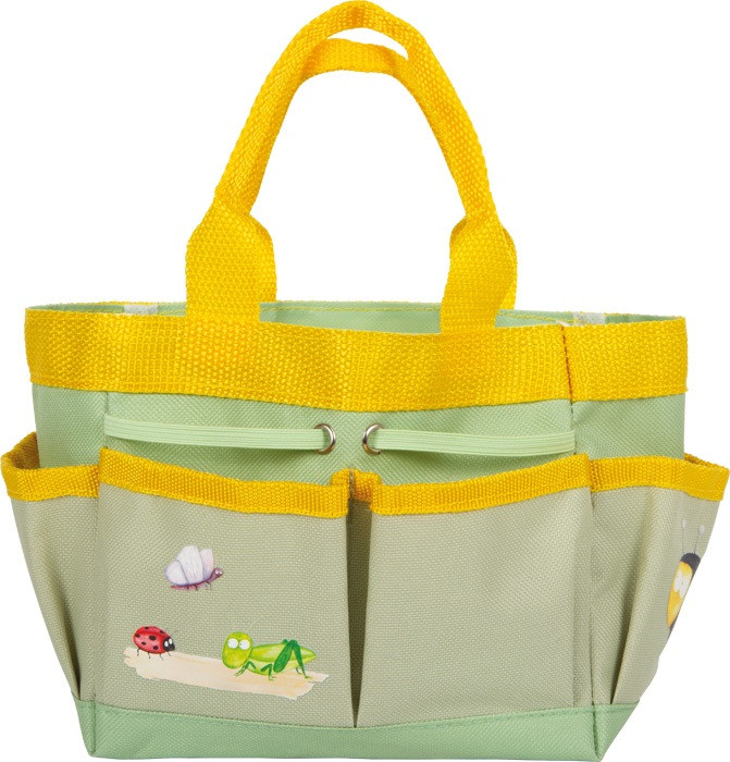 Mindent visz ez a gyermekméretű kerti táska! Tágas főrekesz és külső zsebek, rögzítő gumipántok tartják helyükön a négy fémből és fából készült eszközt (liszteskanál, lapát, kézlapát, kézgereblye) és a különleges 2-az-1-ben locsoló/spricni palackot. Élénk színek, cuki állatminták - kertbe, partra vagy homokozóba. Tartós, praktikus készlet, amely játékosan közelebb hozza a természetet.