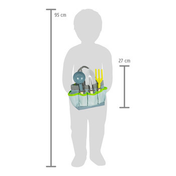 Praktikus hordtáska sok zsebbel és gumipánttal; 6 féle, gyerek kézhez illő fém szerszám natúr fa nyéllel (lapát, szénlapát, kézi ásó, kanállapát, kis gereblye, kapa). Homokozóhoz, strandra és kertbe.