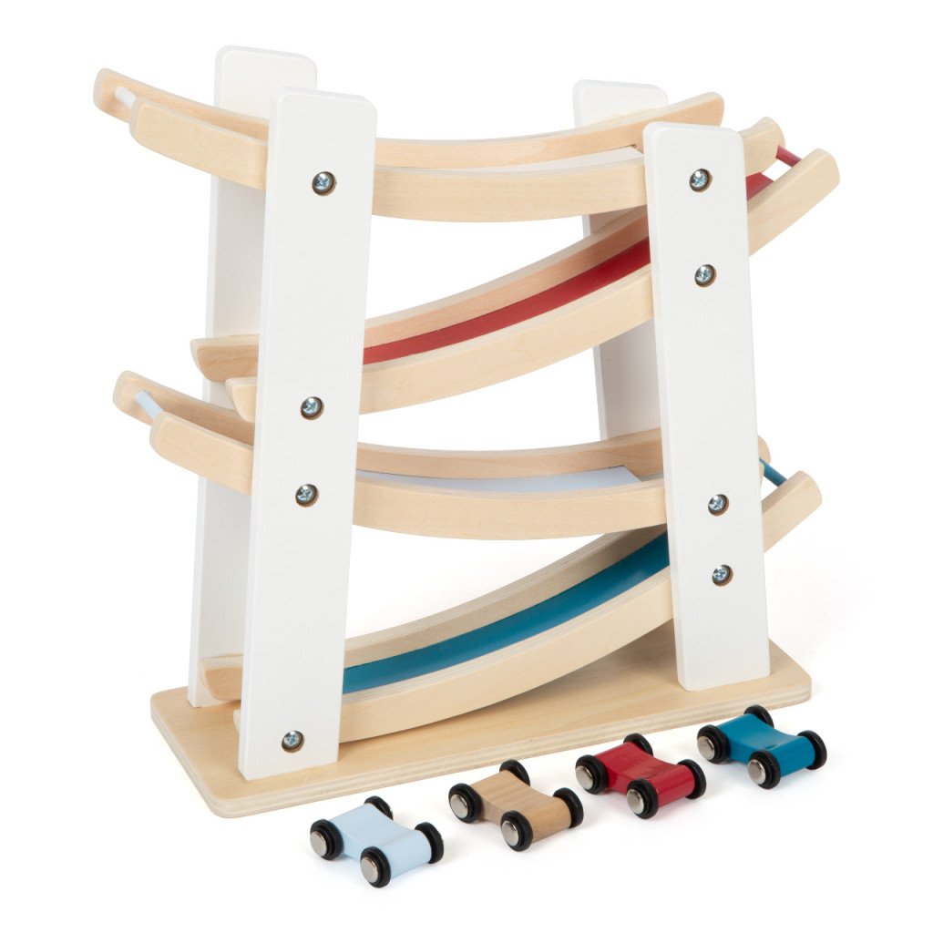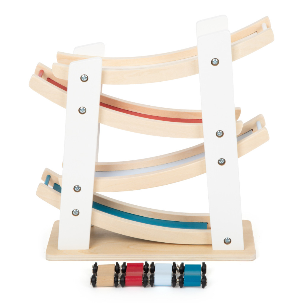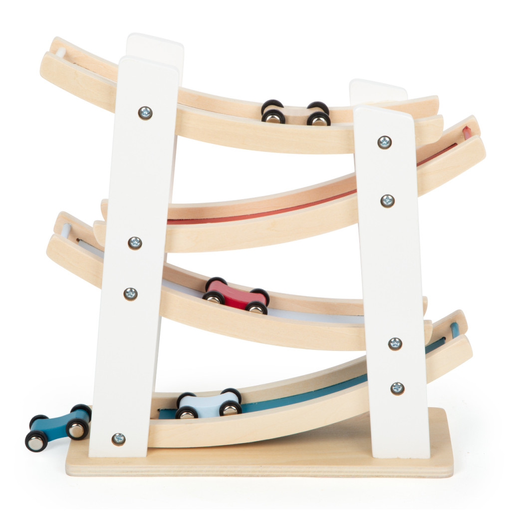 „Klikk-klakk” fa autópálya stabil talppal, 4 kisautóval. Az autók bukfencezve suhannak lefelé, fejlesztve a motorikát és a kéz-szem koordinációt. Természetes fa és fehér színekben.