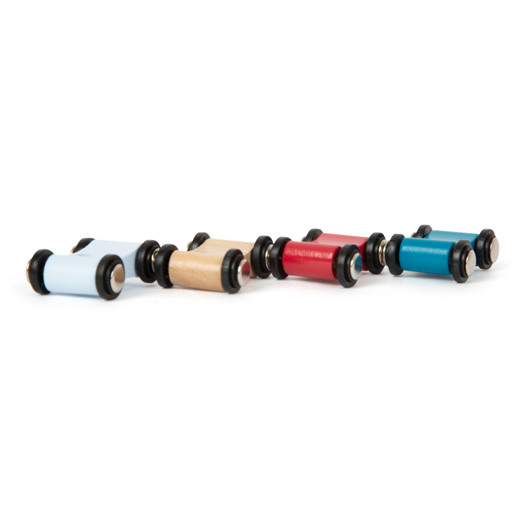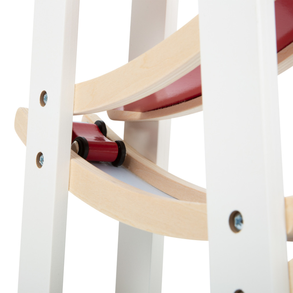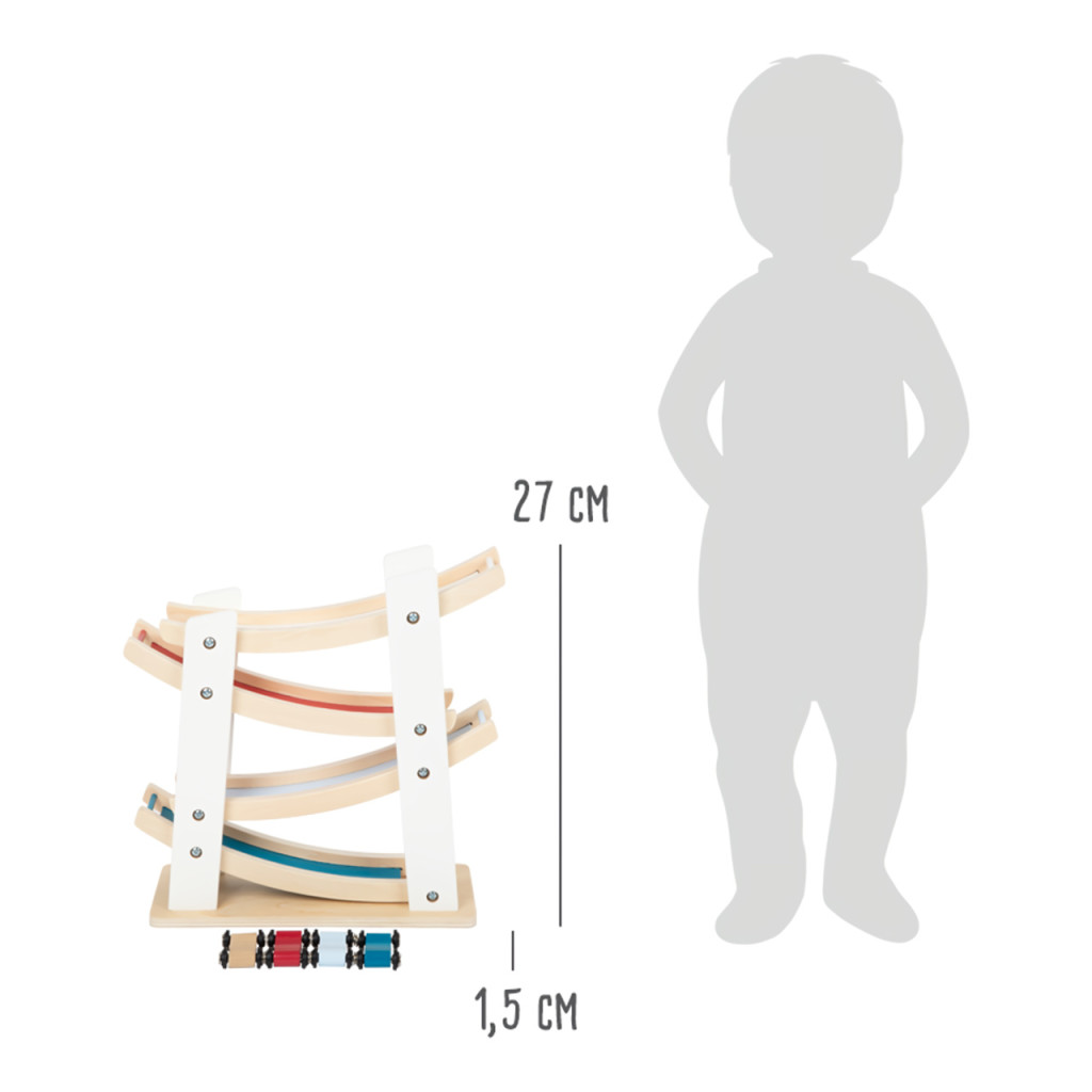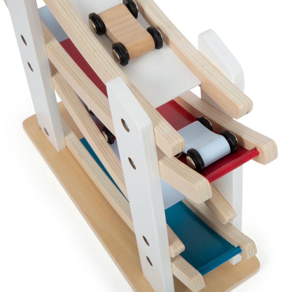 „Klikk-klakk” fa autópálya stabil talppal, 4 kisautóval. Az autók bukfencezve suhannak lefelé, fejlesztve a motorikát és a kéz-szem koordinációt. Természetes fa és fehér színekben.