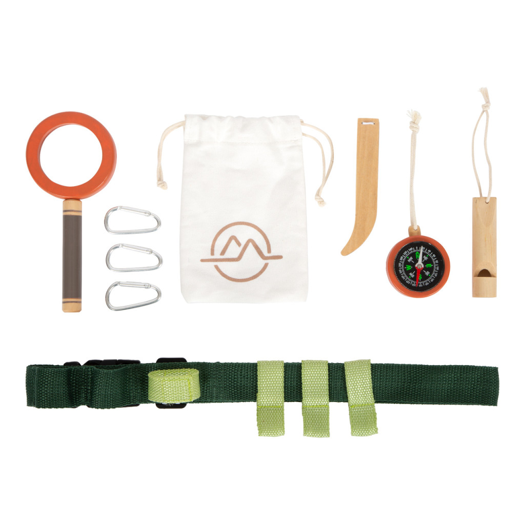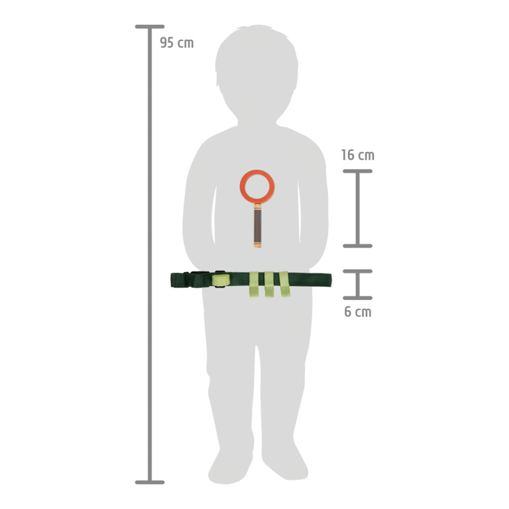 Állítható, csattos öv rögzítési pontokkal + felszerelés: fa síp, nagyító, csipesz, iránytű, kötél és pamut gyűjtőzsák. Kéz szabadon marad; túrához, kalandhoz ideális.
