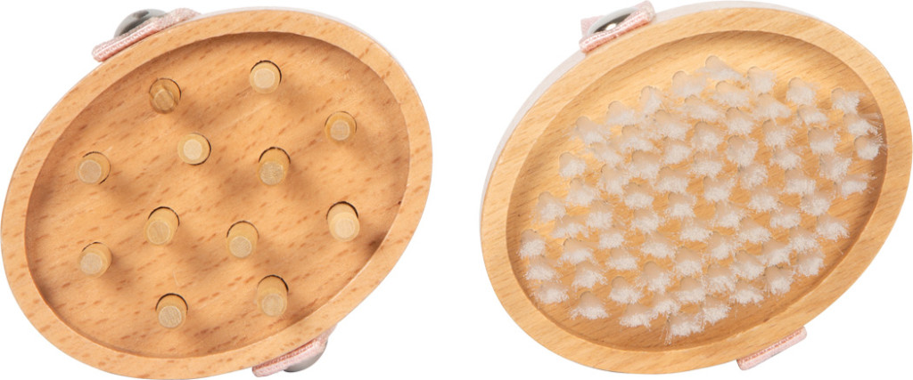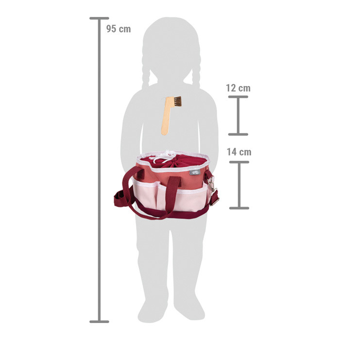Stílusos, rózsaszínes-bordó textiltáska állítható pánttal és nagy nyílással, benne masszív fa ápolóeszközök: kefe, vakaró, patahorog kefével, sörényfésű, valamint falatozni való répa és alma. Oldalzsebekkel, személyre szabható díjszalag matricákkal. Játék közben a gyerekek valósághűen gondozhatják hobbilovukat vagy fa pónijukat, miközben felelősségérzetük és finommotorikájuk fejlődik.