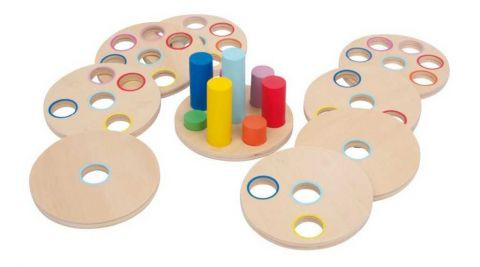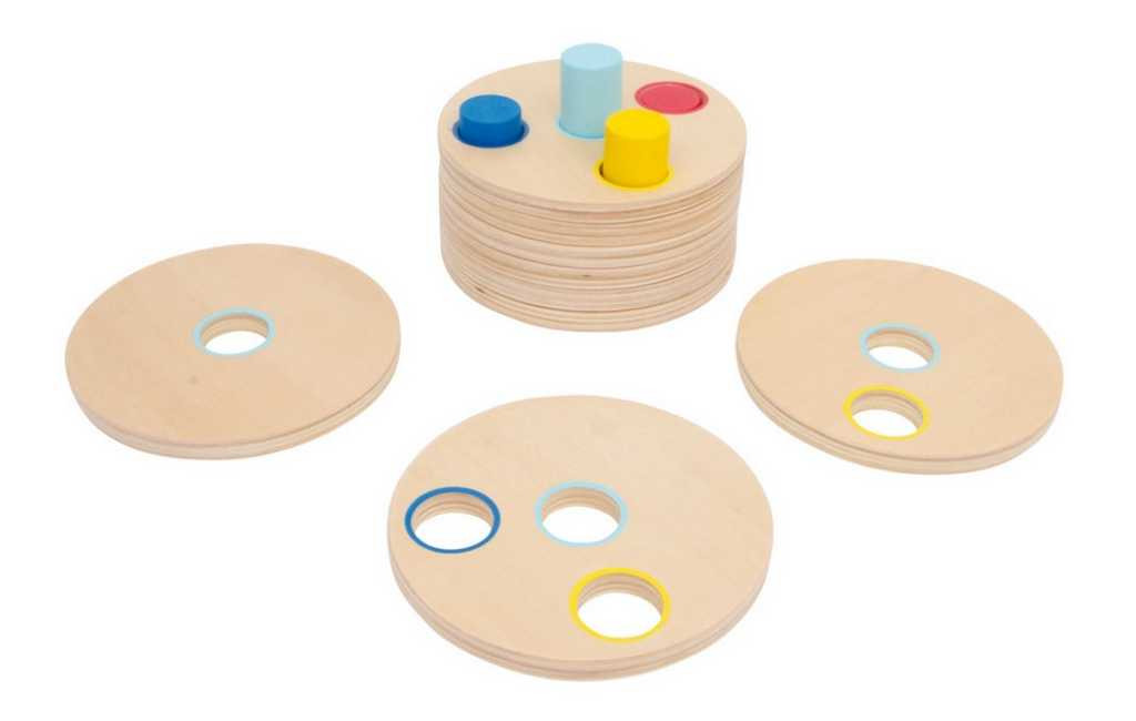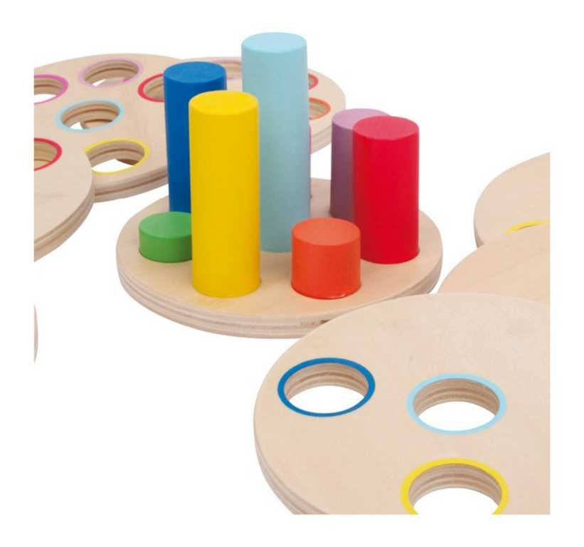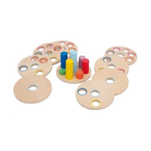 Ez a fa ügyességi játék egyszerre puzzle és logikai kihívás. A színes lyukas korongokat a megfelelő színű oszlopokra kell helyezni, de minden oszlop különböző hosszúságú, a korongok nyílásai pedig mindig kisebbek az előzőnél. Így csak egyetlen helyes megoldás létezik! A játék 8 stabil, fából készült korongot tartalmaz, és fejleszti a kézügyességet, a logikát és a kéz-szem koordinációt. Szórakoztató kihívás gyerekeknek és felnőtteknek egyaránt.
